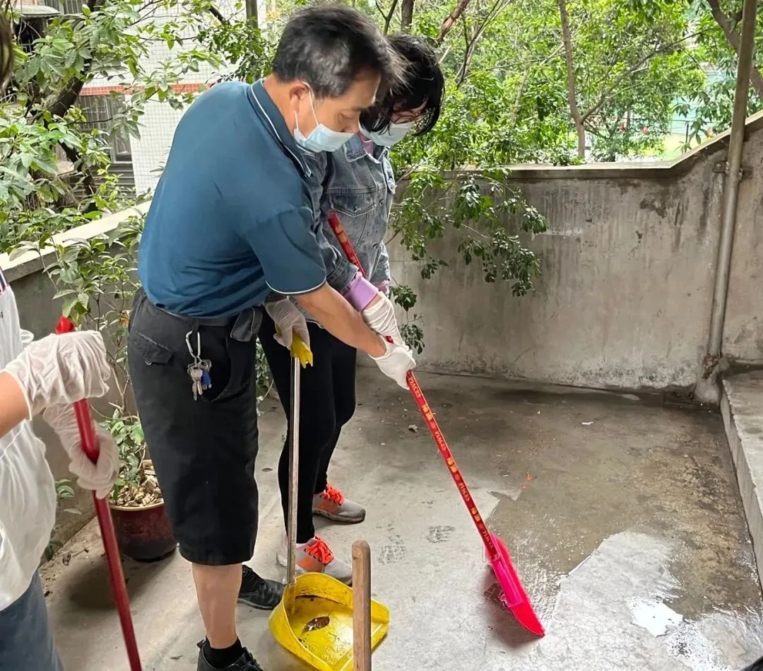 环卫工人手把手指导志愿者体验日常清洁工作。
