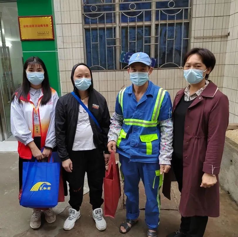 社工与志愿者共同为环卫工人送上慰问品,表达对环卫工人的感激。