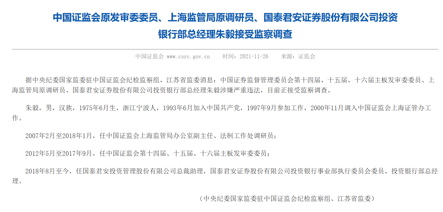 11月26日,记者从证监会官网获悉,据中央纪委国家监委驻中国证监会纪检监察组、江苏省监委消息,中国证券监督管理委员会第十四届、十五届、十六届主板发审委委员、上海监管局原调研员、国泰君安证券股份有限公司投资银行部总经理朱毅涉嫌严重违法,目前正接受监察调查。
