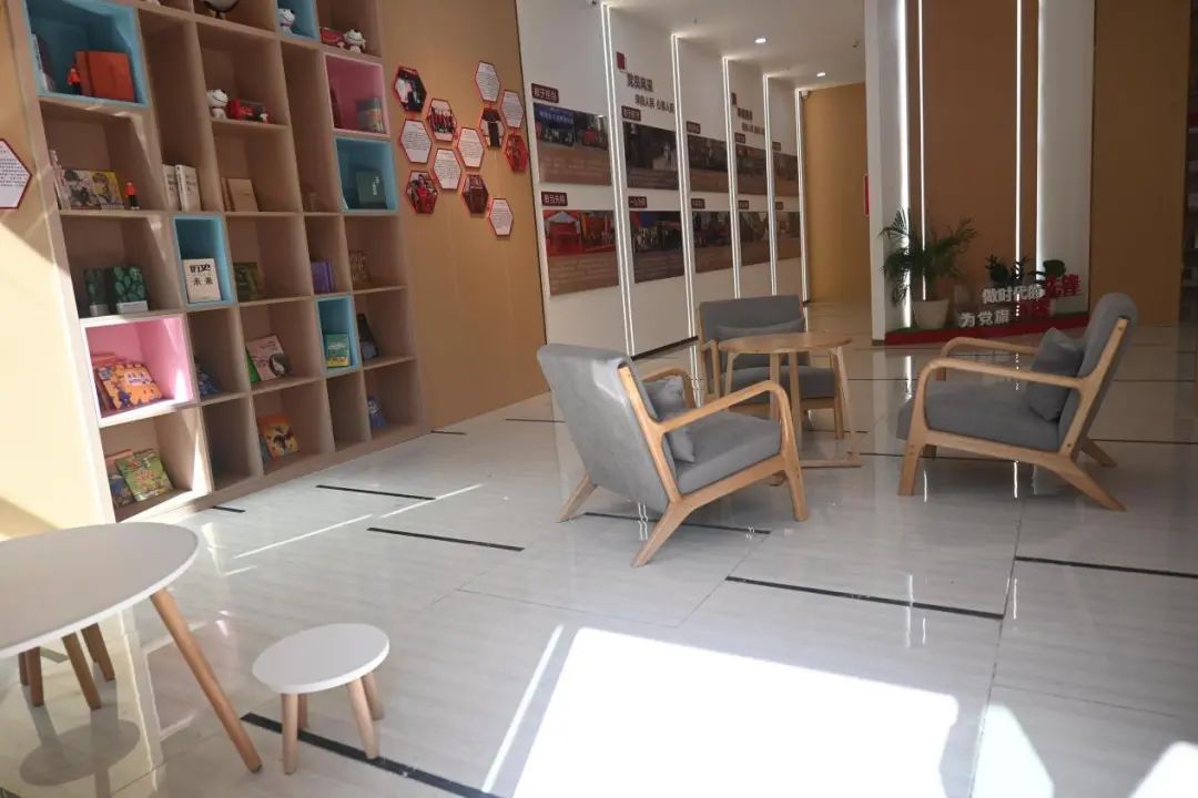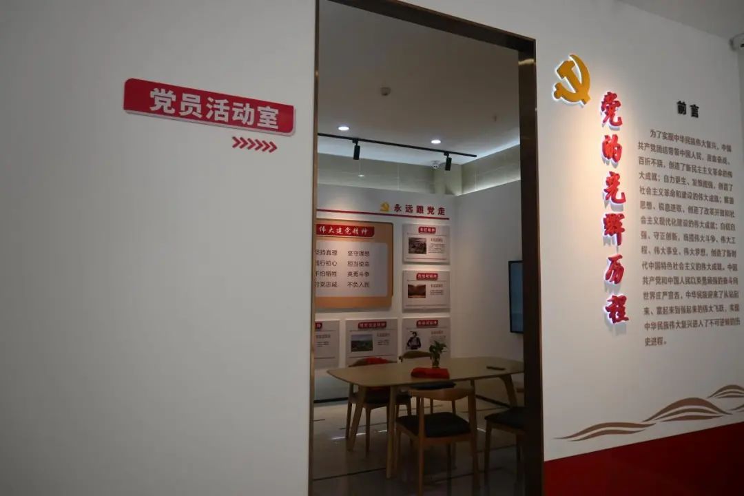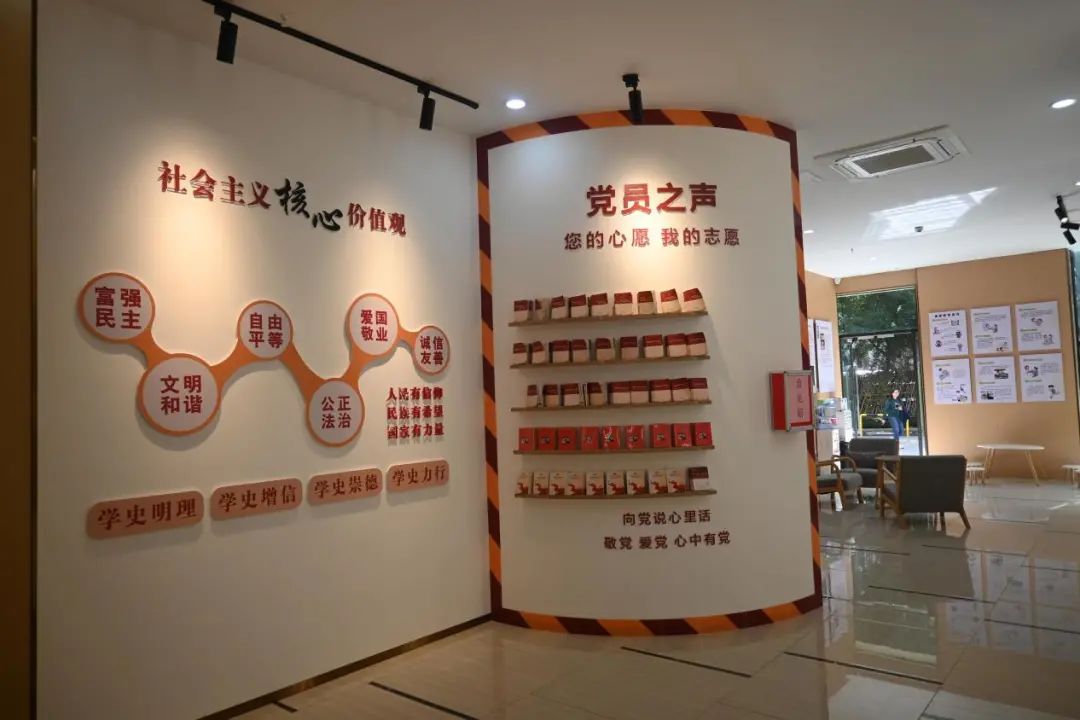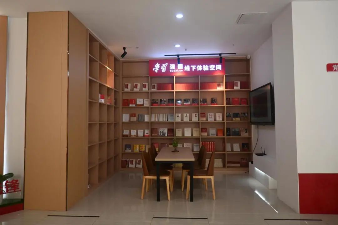 该“学习强国”线下体验空间设置了学习强国加油站、居民休闲阅览区、党史展示区、党员活动室和快递小哥爱心驿站五大空间。