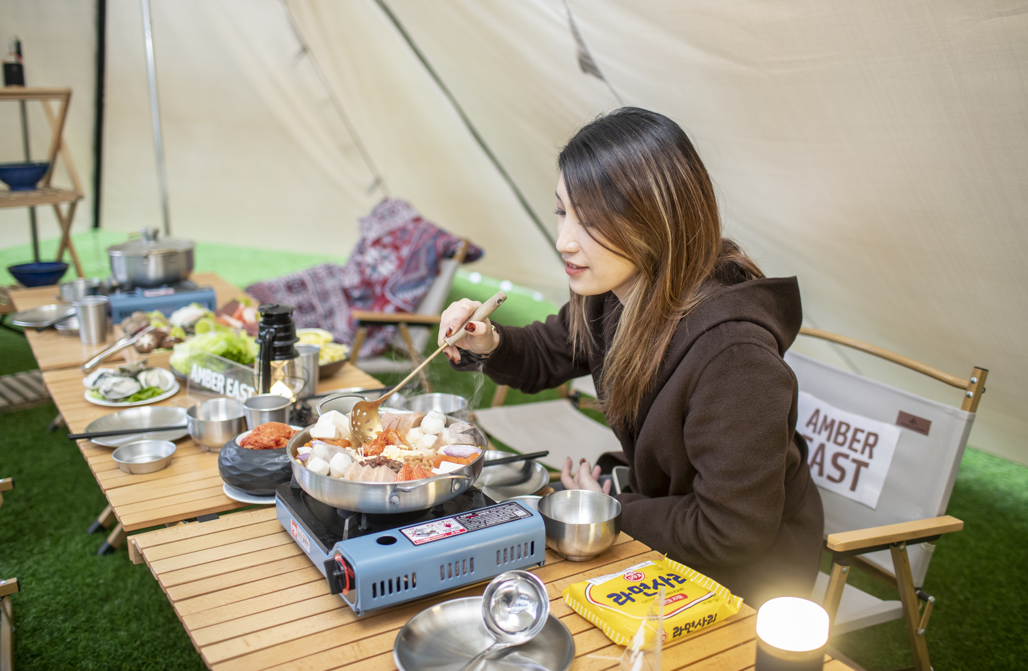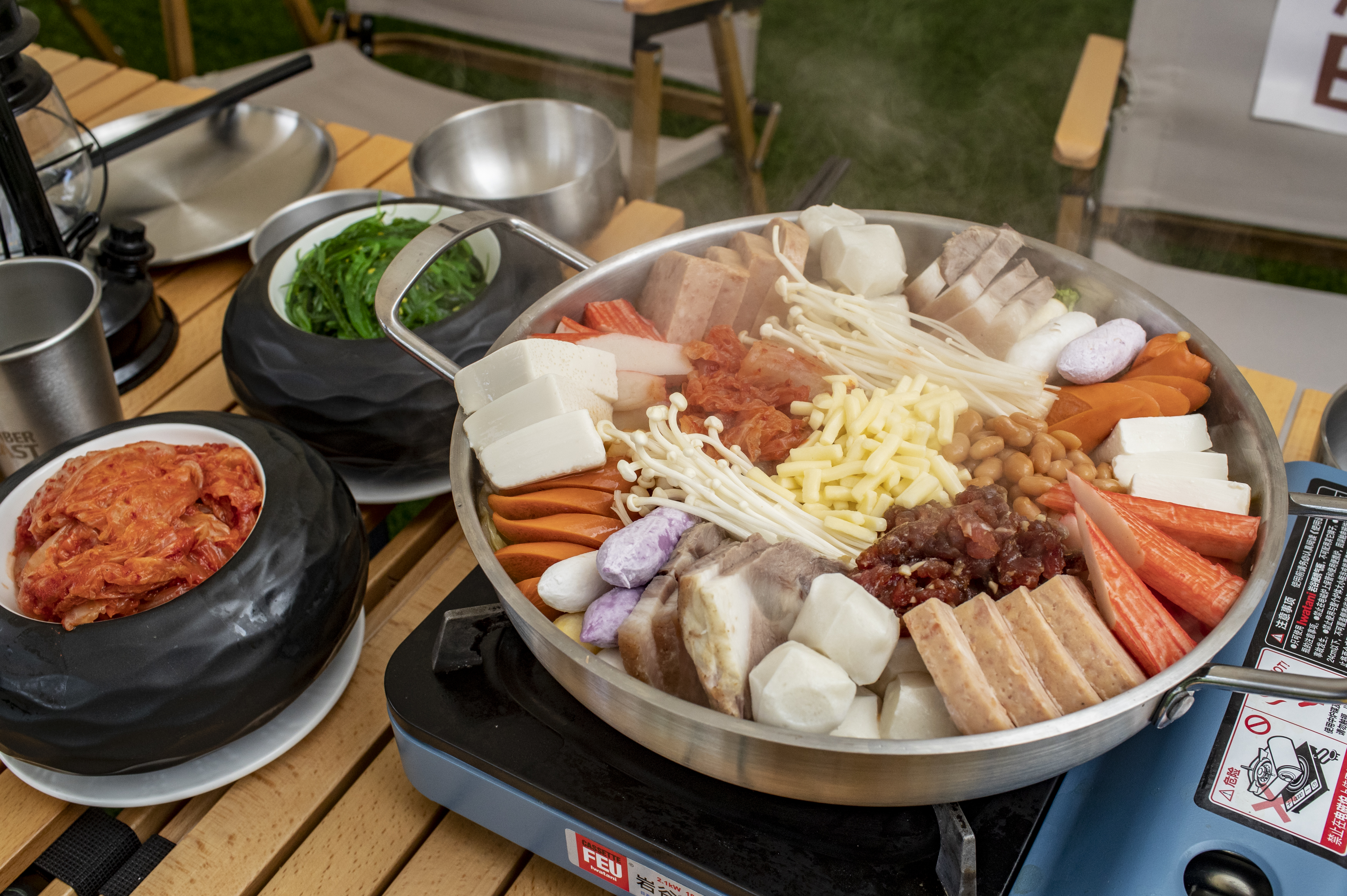 记者探营见到,这个位于天台的露营地搭起了天幕帐篷,私密性十足,既有容2人的小帐篷,也有容纳10人的大帐篷。夜间,这儿有两款火锅供应:露人皆芝火锅和琥珀九宫格火锅。前者是芝士泡菜火锅,后者是海鲜肥牛鲜汤火锅。芝士泡菜火锅实则是在大名鼎鼎的一种韩国火锅基础上变化而来的。旧时这种火锅材料简单,只是午餐肉、火腿、豆腐、酸白菜和辣酱罢了。这是当时年代所限制。