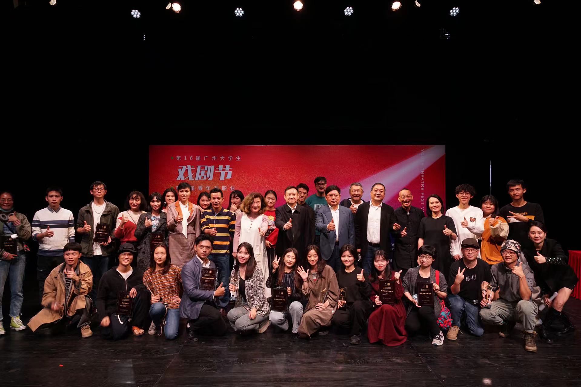 11月28日下午,由广州市文化广电旅游局、广州市文学艺术界联合会主办,广州话剧艺术中心、广州市戏剧家协会承办的“第十六届广州大学生戏剧节暨第九届青年非职业戏剧节”(以下简称“大戏节”)在广州话剧艺术中心U13戏剧空间举行闭幕式既颁奖典礼。