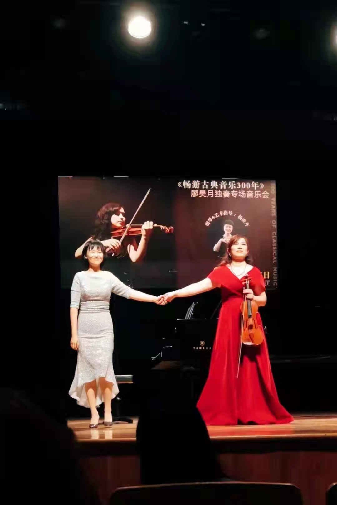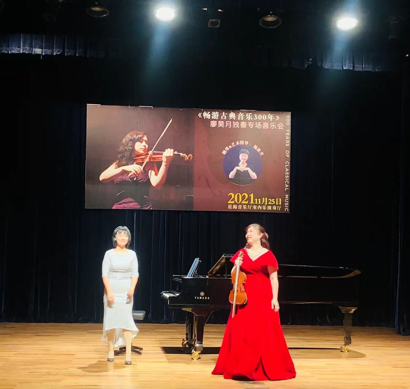 当晚,廖昊月着一身大红色长裙登台,先以被誉为“西方古典音乐之父”的巴赫的《无伴奏小提琴奏鸣曲和组曲》中的一曲开场。随后,钢琴家杨世芹身着一袭亮白色裙上场,两人合作了从十七世纪的巴洛克时期到二十世纪的印象派,跨度长达三百年音乐历程中的小提琴代表作,选取莫扎特、勃拉姆斯、德沃夏克、巴托克、克莱斯勒、德彪西等音乐巨匠的经典之作加以演绎。