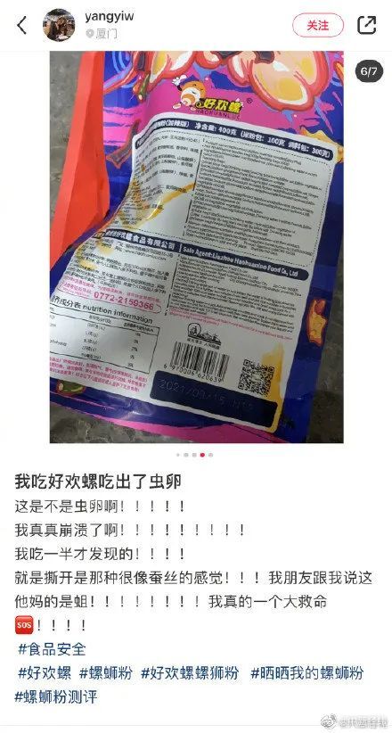 该网友发布的信息称,制作好欢螺螺蛳粉时,并未发现其中的虫卵。而在食用时,突然吃到异物,吐出后发现是一团白色条状物,疑似虫卵。