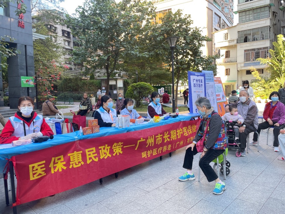 活动现场,社区护士、康复治疗师、专业护理人员向社区居民宣传广州市医保长期护理保险政策,并为现场市民提供在“家门口”的医疗护理服务:血糖血压测量、康复指导和训练、常见慢病管理建议、营养及健康指导等。
