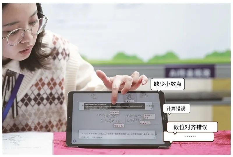 ▲南沙区金洲小学教师正在分享介绍AI批改辅导技术。一份被作业机批改后的作业,会留下成绩、错误原因以及订正框,学生可以直观地看到自己错误的原因和地方。