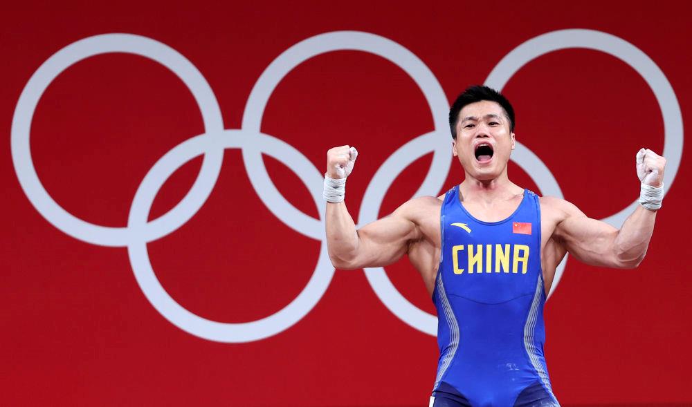 7月31日,吕小军在东京奥运会举重男子81公斤级决赛夺冠后庆祝。