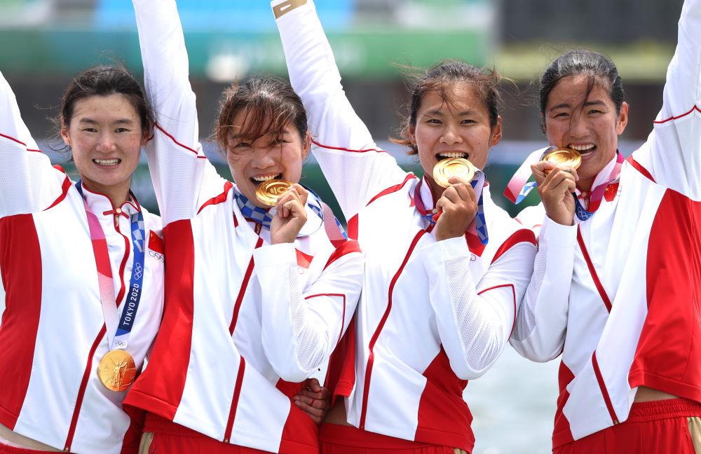 在东京奥运会赛艇女子四人双桨决赛中,崔晓桐、张灵、陈云霞和吕扬紧密合作,一路领先,以6分05秒13的世界最好成绩夺冠。