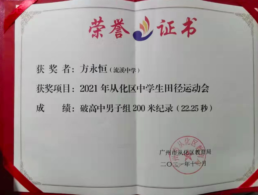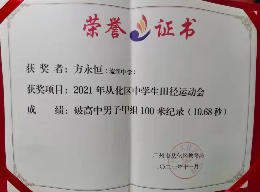 在近日举办的2021年广州市从化区中学生田径运动会上,来自从化流溪中学高三的学生方永恒获得高中组100米和200米冠军,并以10.68秒、22.25秒(电子计时)打破尘封多年的从化区100米和200米纪录,成为从化区首位100米跑进11秒内的中学生。