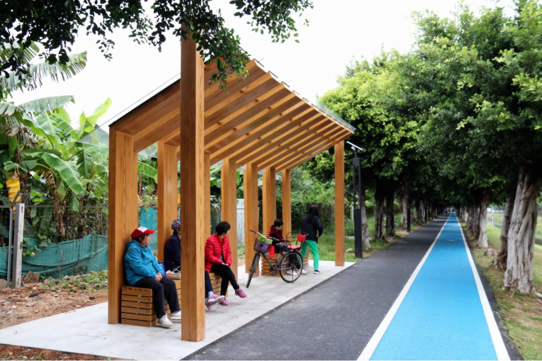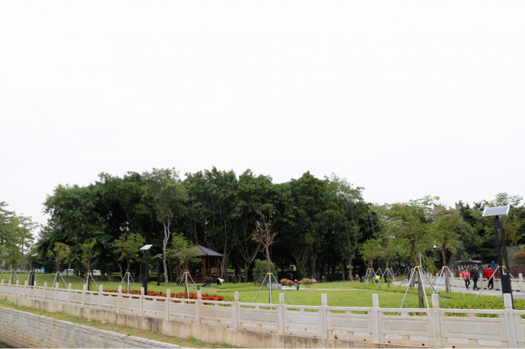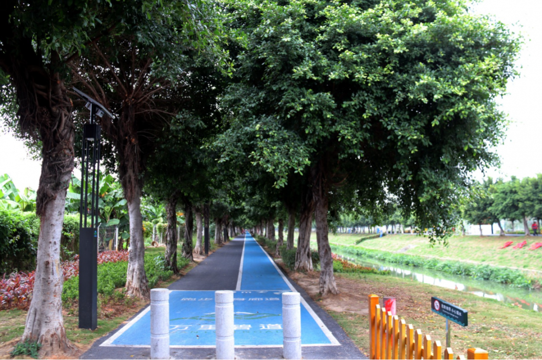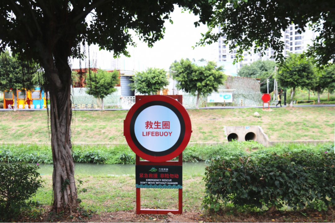 沿着步道往前走,一路上都设有指示牌、导视牌、警示牌、距离标识、宣传栏、座椅、垃圾桶、太阳能路灯、救生圈,此外,步道一侧还设置了教育标志牌,街坊可以随时随地学习健康知识。步行至榄塘村牌坊南侧,便到达了碧道景观节点“口袋公园”。