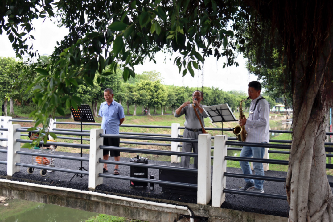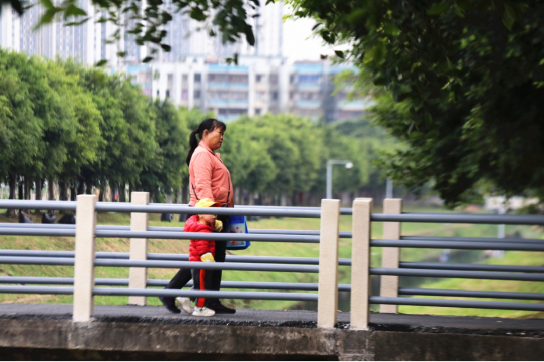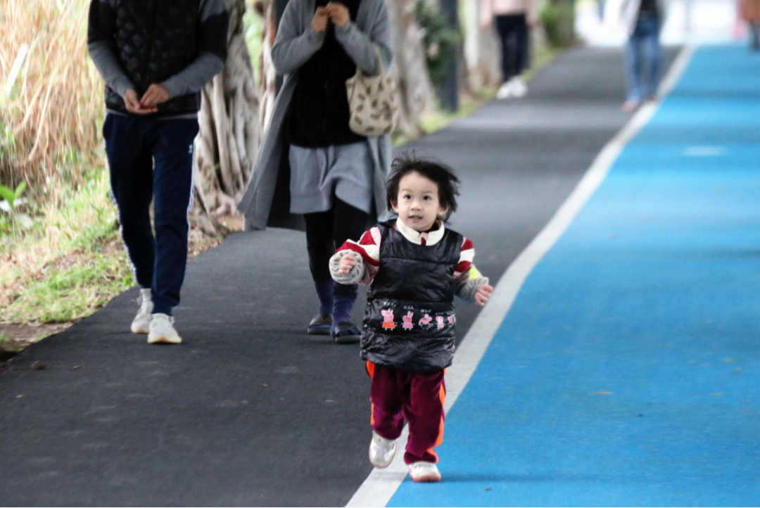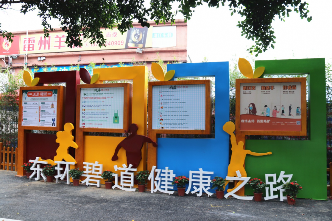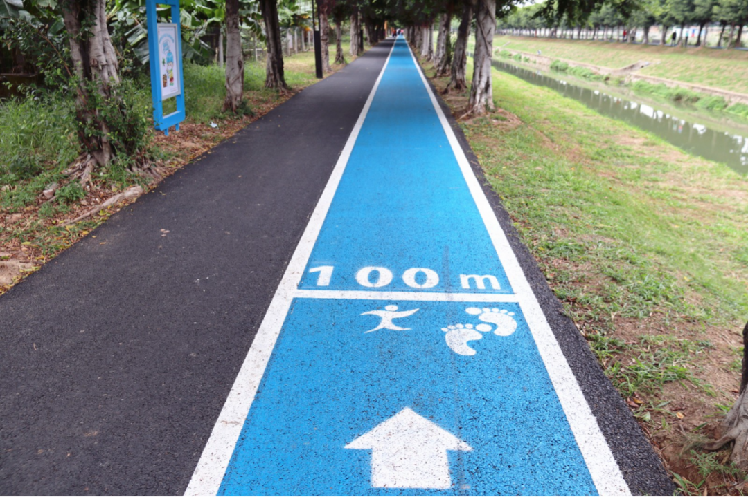 沿着步道往前走,一路上都设有指示牌、导视牌、警示牌、距离标识、宣传栏、座椅、垃圾桶、太阳能路灯、救生圈,此外,步道一侧还设置了教育标志牌,街坊可以随时随地学习健康知识。步行至榄塘村牌坊南侧,便到达了碧道景观节点“口袋公园”。