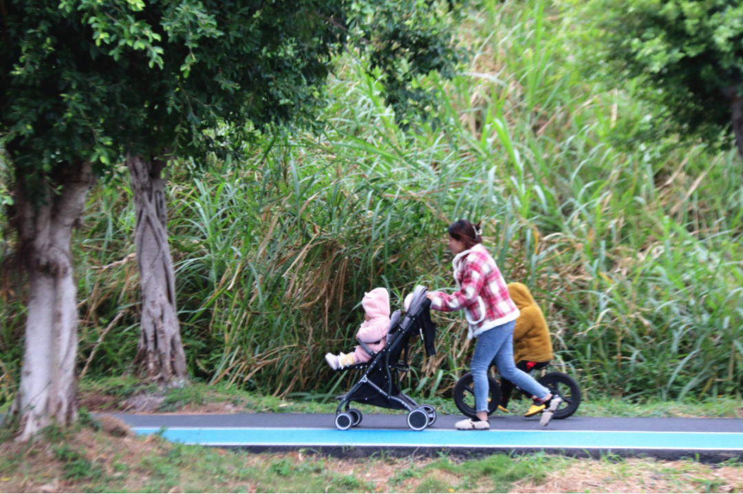 日前,记者来到了左边村龙岗桥的碧道入口处,只见一条蓝色骑行道与一条黑色步行道,沿河岸向西延伸,步道两侧绿树成荫,不少街坊正在散步或骑行。