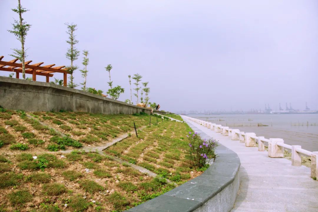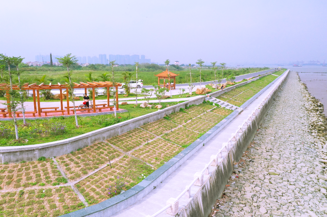 只见,碧道的东面是碧波荡漾的狮子洋,船只在水面游弋,白鹭在空中飞翔,还有一片片红树林;一条2.5米宽的亲水长廊沿着堤围呈南北走向延伸,步行在亲水长廊上面,可以与狮子洋零距离接触;碧道与亲水长廊之间有迎水坡,迎水坡里芳草萋萋;碧道外侧修建了防浪墙,绿化带种植了植物,与狮子洋的水环境协调。
