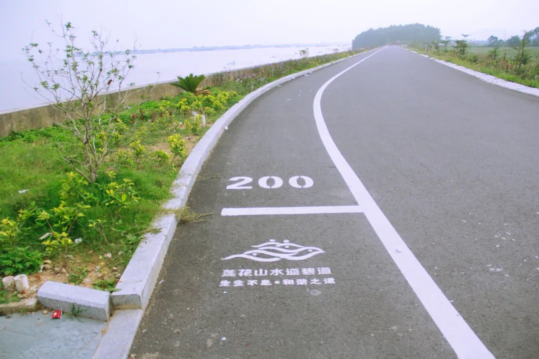 为响应番禺区2021年健康步道建设号召,推广践行健康生活方式的良好氛围,莲花山水道碧道沿线还设置了健康步道标识牌及健康步道LOGO,每段首尾各设一个起点牌和终点牌,每隔500米在路面喷涂一个健康步道里程LOGO,方便市民在此健身锻炼。同时,通过对景观及游憩系统的升级改造,将莲花山碧道打造成健康生态长廊,形成莲山圣境,为周边居民提供一个优美的休闲散步长廊。
