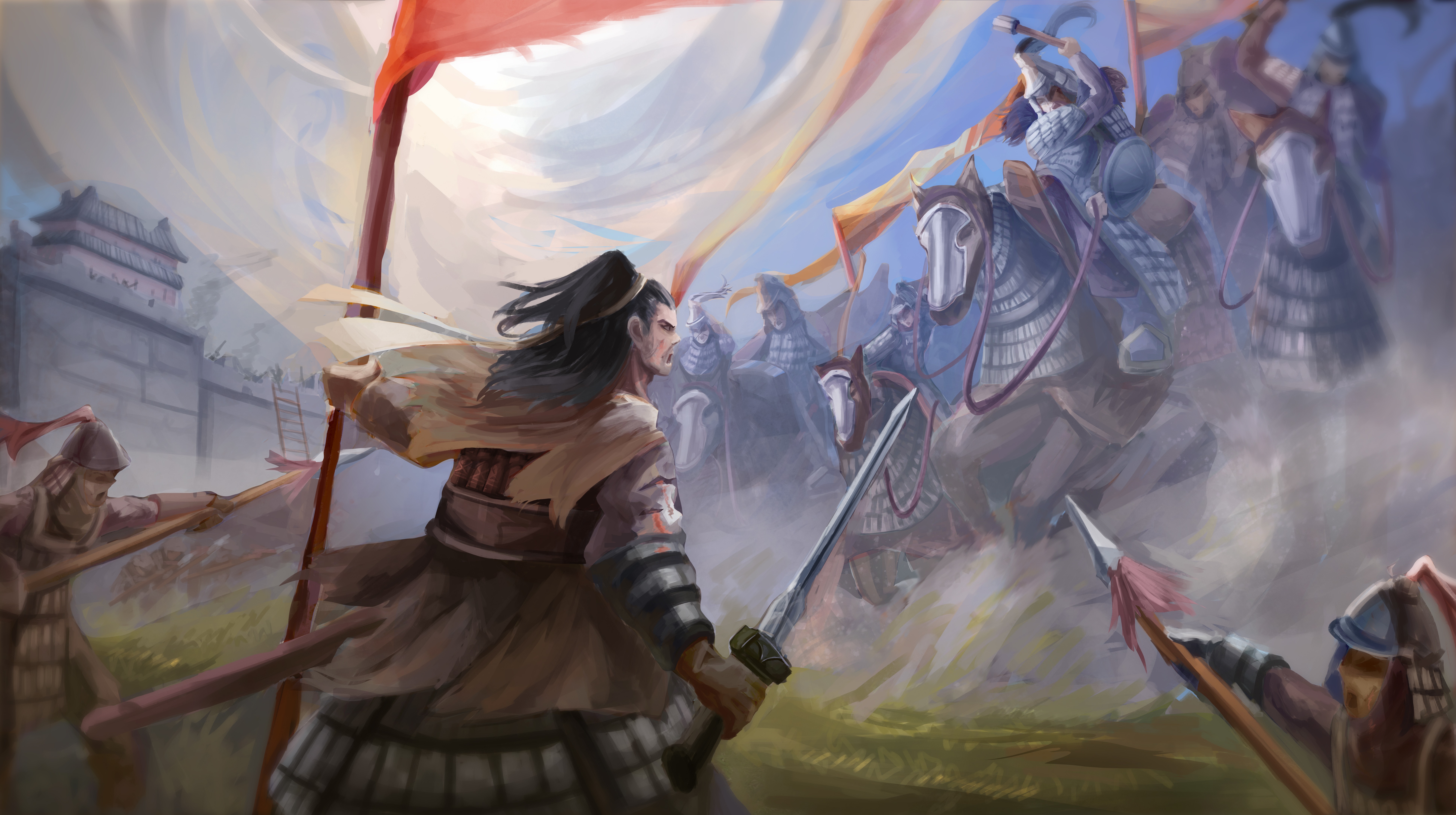 陈晓韵作品《襄阳飞烟》描绘了《神雕侠侣》中郭靖镇守襄阳,浴血奋战的场景。黄沙蔽天,双雕低旋,衬托出战事之激烈。郭靖弯弓搭箭,目光炯炯,透露出誓死捍卫河山的决心。