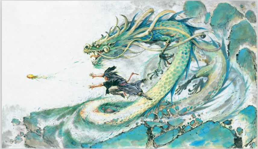 南漫画派作品《神掌降龙》,以盘旋的巨龙展现出《天龙八部》中萧峰使用“降龙十八掌”时气吞山河的威力。作品主色调采用《千里江山图》中的三青、三绿色,萧峰身后是千里江山,与小说中萧峰保卫疆土、心系苍生的形象相吻合。