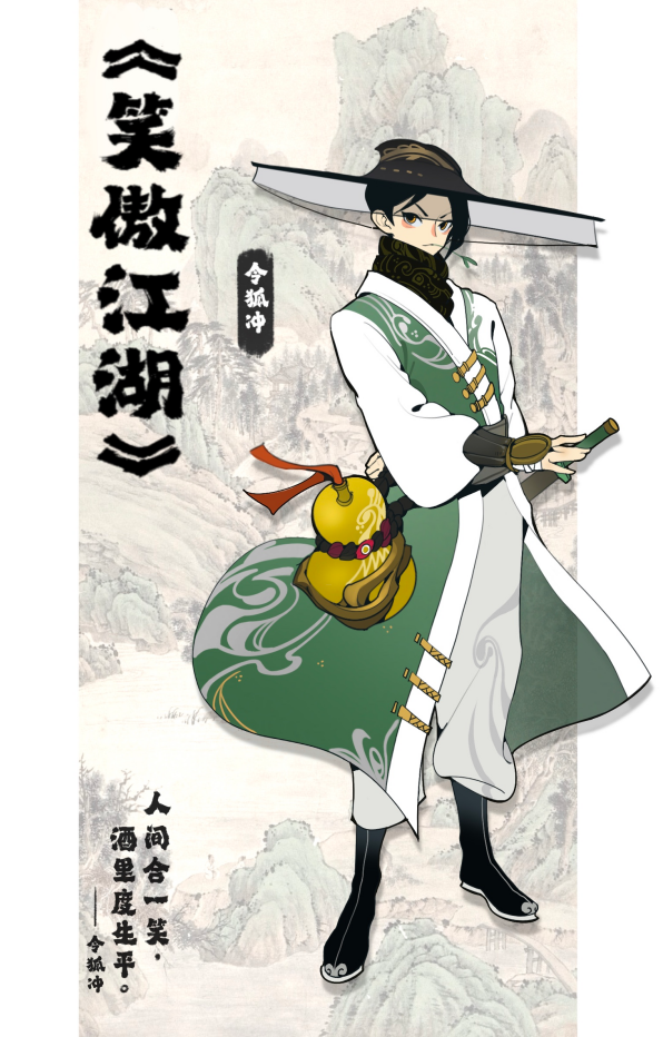 吴雨晨作品《华山论剑——令狐冲》为《笑傲江湖》中男主角设计了卡通漫画形象。通过剑、酒壶等配件衬托令狐冲潇洒不羁的剑客形象。评委们对此作品人物构型的完整度以及古画作背景的设计思路给予好评。