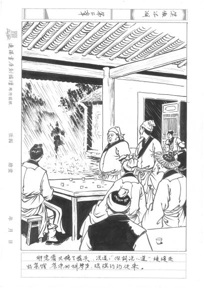 余晟文作品《洪七公》以刚劲的笔力呈现了《射雕英雄传》中“北丐”洪七公使用“降龙十八掌”时蓄势待发、掌下生风的画面,富有张力和动态感,刻画出小说中洪七公豪放而刚毅、质朴而仁厚的形象。其成熟的作画技法获得评委们的赞赏,但李志清先生仍十分审慎地说:“画面很有张力,但我觉得他的面相应该表现得更正气、大气,那么将对人物精神面貌的表现更好。”