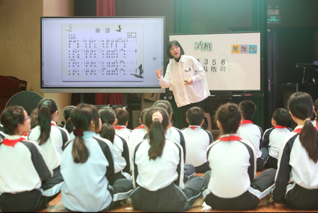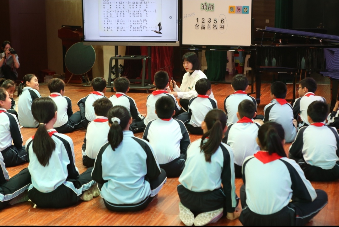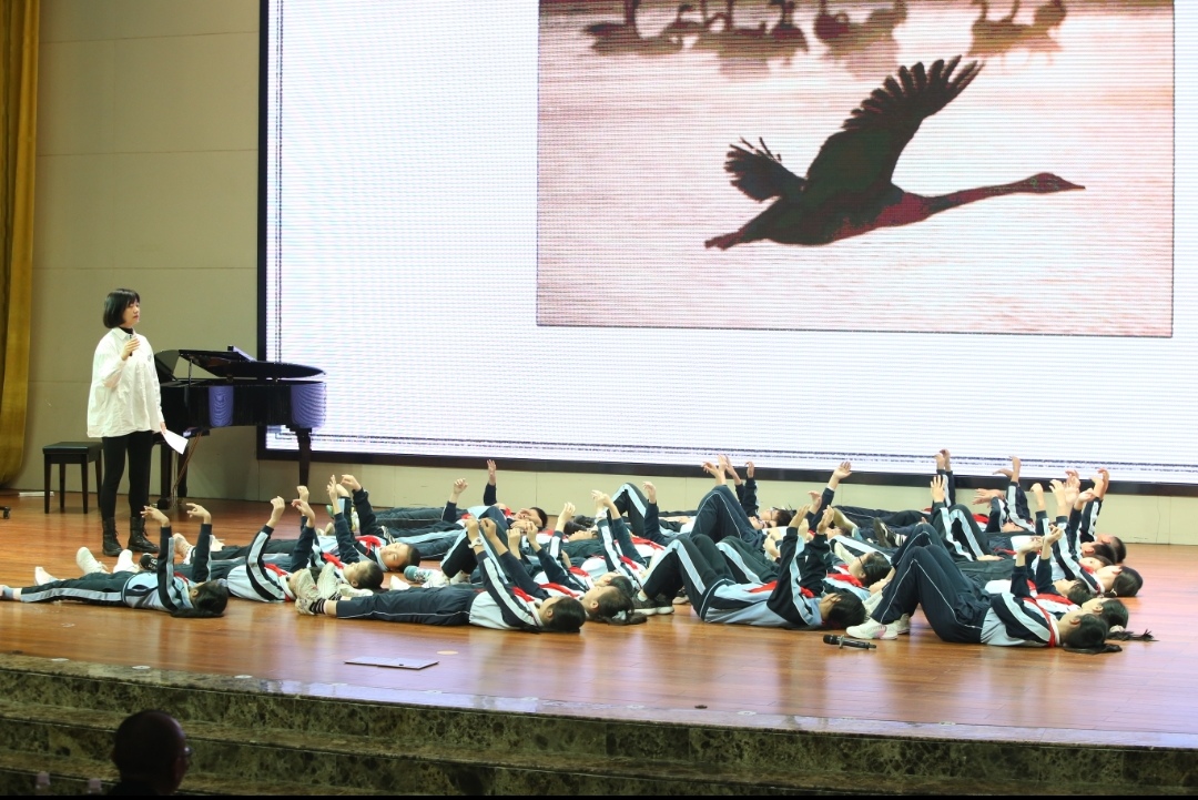 上午进行的是龚令仪老师的音乐公开课。龚老师用教育戏剧的方式讲述名曲《鸿雁》。在播放乐曲的同时,龚老师展示了大量的图片,还让孩子们用最舒服的姿势躺在地上,用心去品味音乐,去体会照片。当悠扬的旋律响起,配上一张张苍凉而深远的大漠景色的照片,孩子们纷纷告诉老师,“我听到了荒凉”“我听到了对自由的向往”……