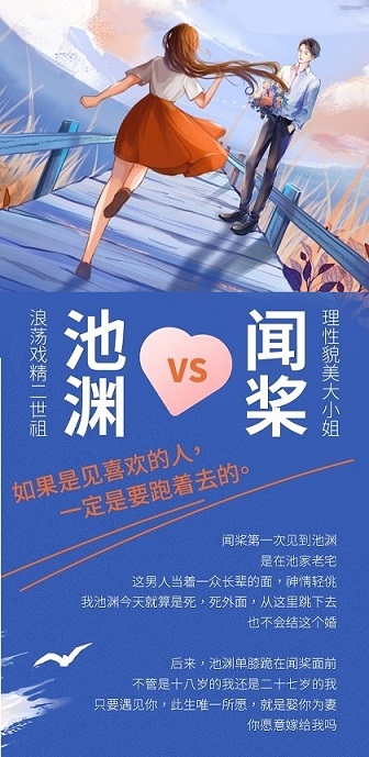 这本书中的男、女主角交集的原因并不是一见钟情那种浪漫邂逅,恰恰相反,是最不浪漫的利益结盟。所以男主角池渊一开始以死明志,因为这种初遇与他想象中的爱情相去甚远。但相处中,不知不觉间他的目光就慢慢投到了她的身上,闻桨也慢慢将他放进了心里。谁知在一切向好的发展中,二人却得知联姻另有缘由,最后不了了之。