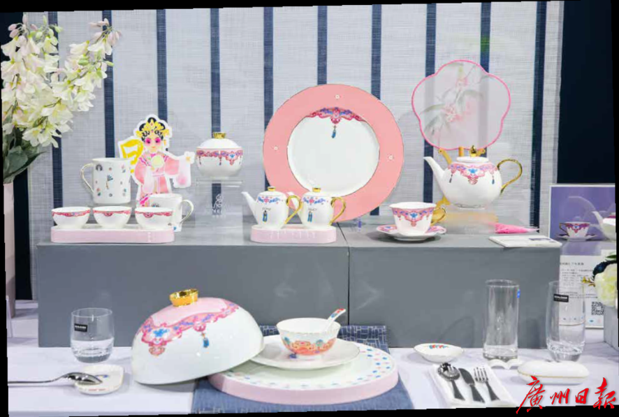 属于骨瓷文创产品,《花间意》茶具的设计灵感源于戏剧角色花旦的形象。