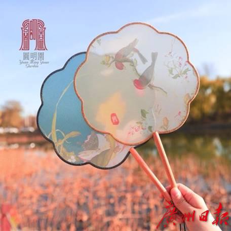 团扇设计来源于仙萼长春图,仙萼长春图为中国清代的画家郎世宁所绘制。里面的各种花卉种类繁多色彩丰富,体现了宫廷画师的技艺高超。团扇图案选择了荷花慈姑花与海棠玉兰素,与传统的八边行相结合,体现了圆明园中西结合的鲜明特色。