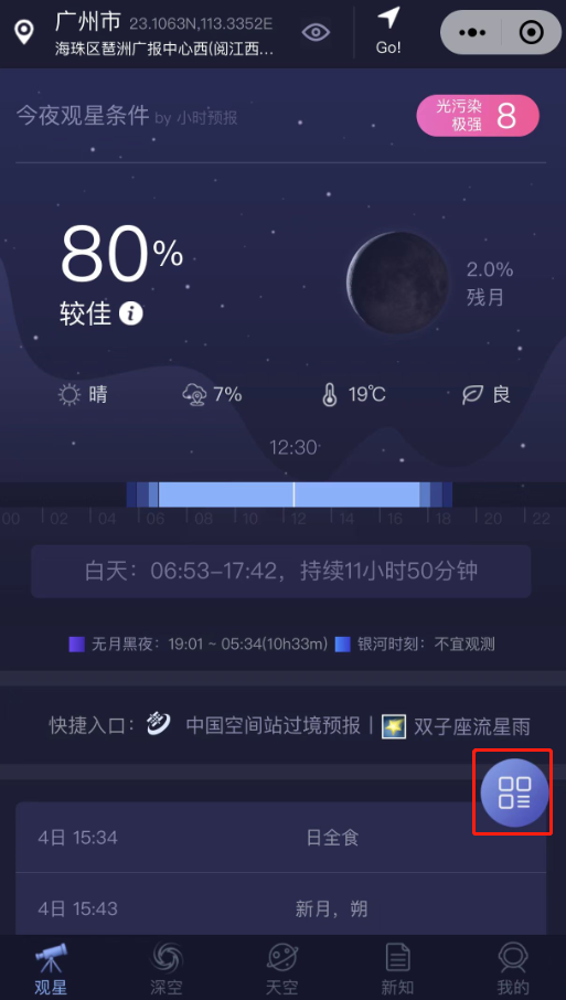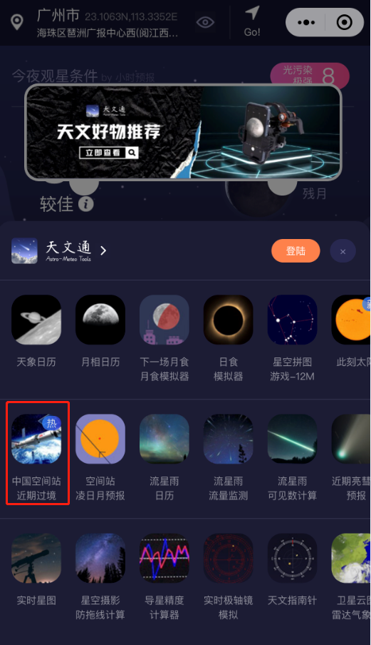 使用“天文通”等小程序或专业APP可查看所在地的过境信息,在天气晴好的情况下,即使是在城市中心也能轻松地观测到,如果运气好,一晚上会看到好几次中国空间站漫步苍穹的画面。