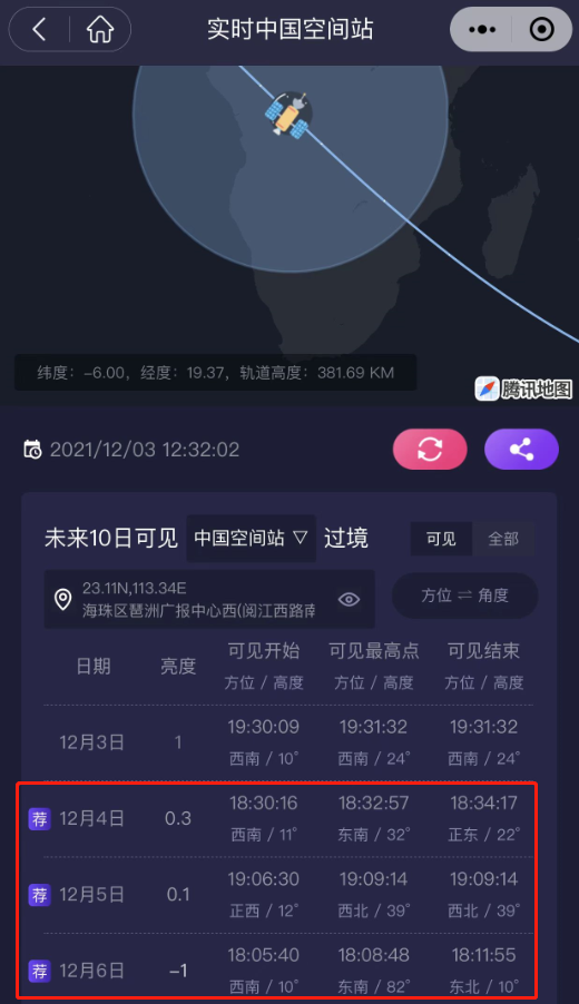 3、在这里可以查到中国空间站过境信息和最佳观测时间及位置。