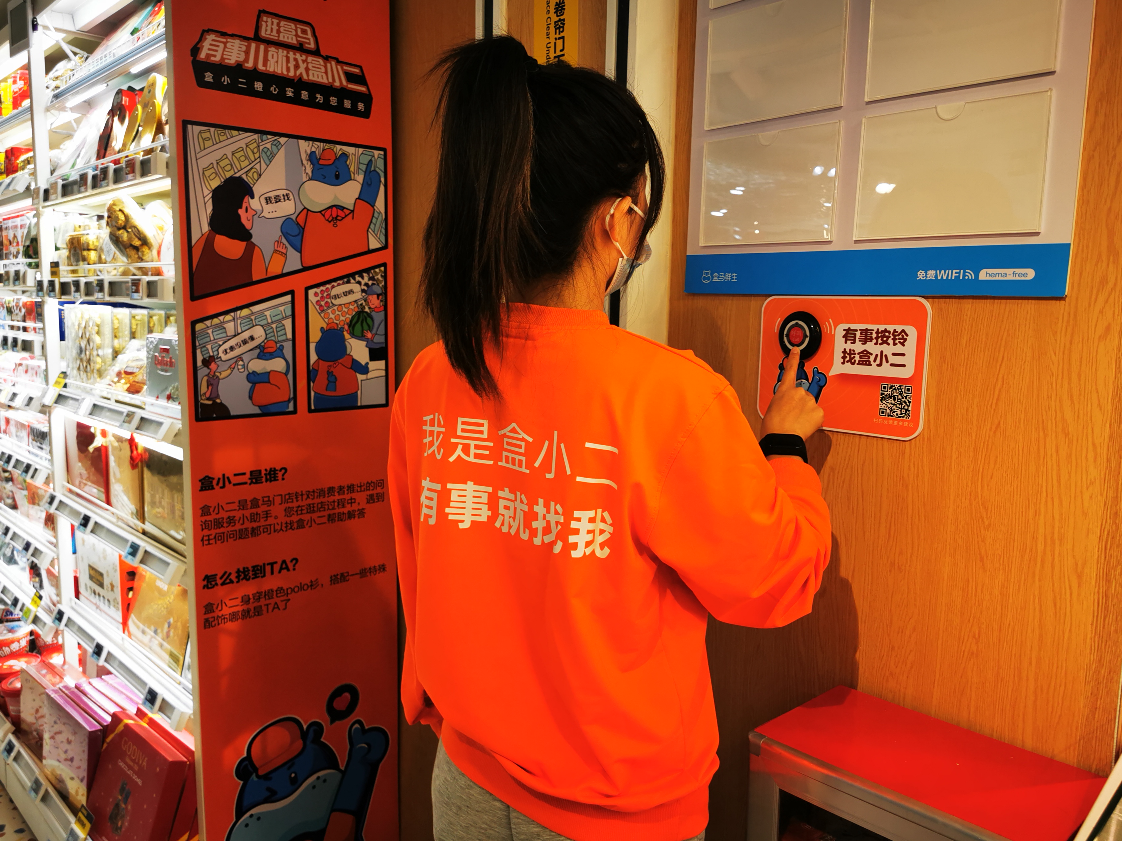 另外,在该新店设有“盒小二”服务,顾客在逛店过程中,遇到任何问题只要按一下橙色的铃,“盒小二”就会出现帮忙解决。