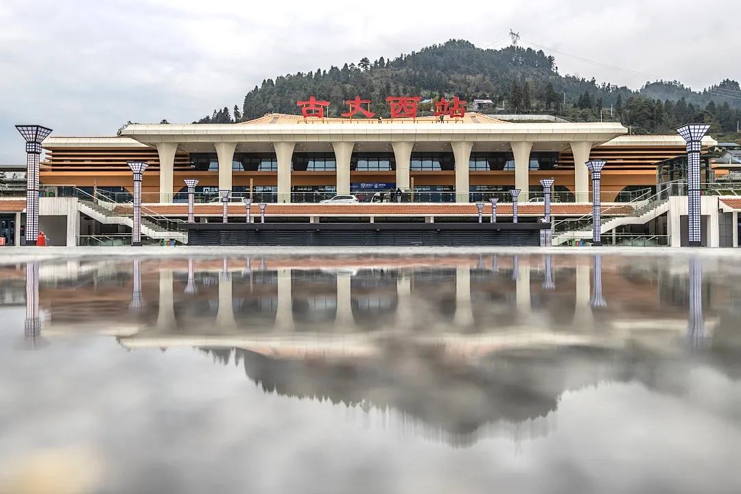 古丈西站位于古丈县古阳镇境内,站房设计立意:山海石林、古丈新韵,创意源于当地独一无二的“九山半分田”地貌特征。