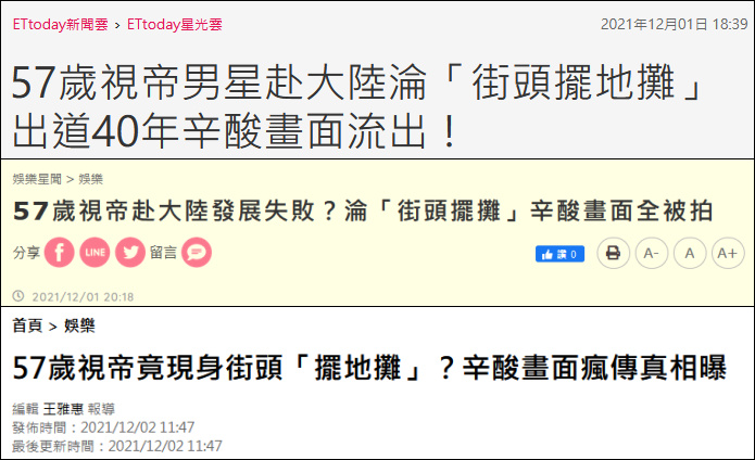 最近兩天,不少台媒都在瘋傳一則「香港影星在大陸發展凄涼」的新聞,標題清一色震驚體:「57歲視帝男星赴大陸淪『街頭擺地攤』!」「出道40年辛酸畫面流出」,配圖是一名穿着黑色羽絨服的男子坐在小馬紮上彈吉他,面前桌子上擺滿吉他、口風琴等樂器。