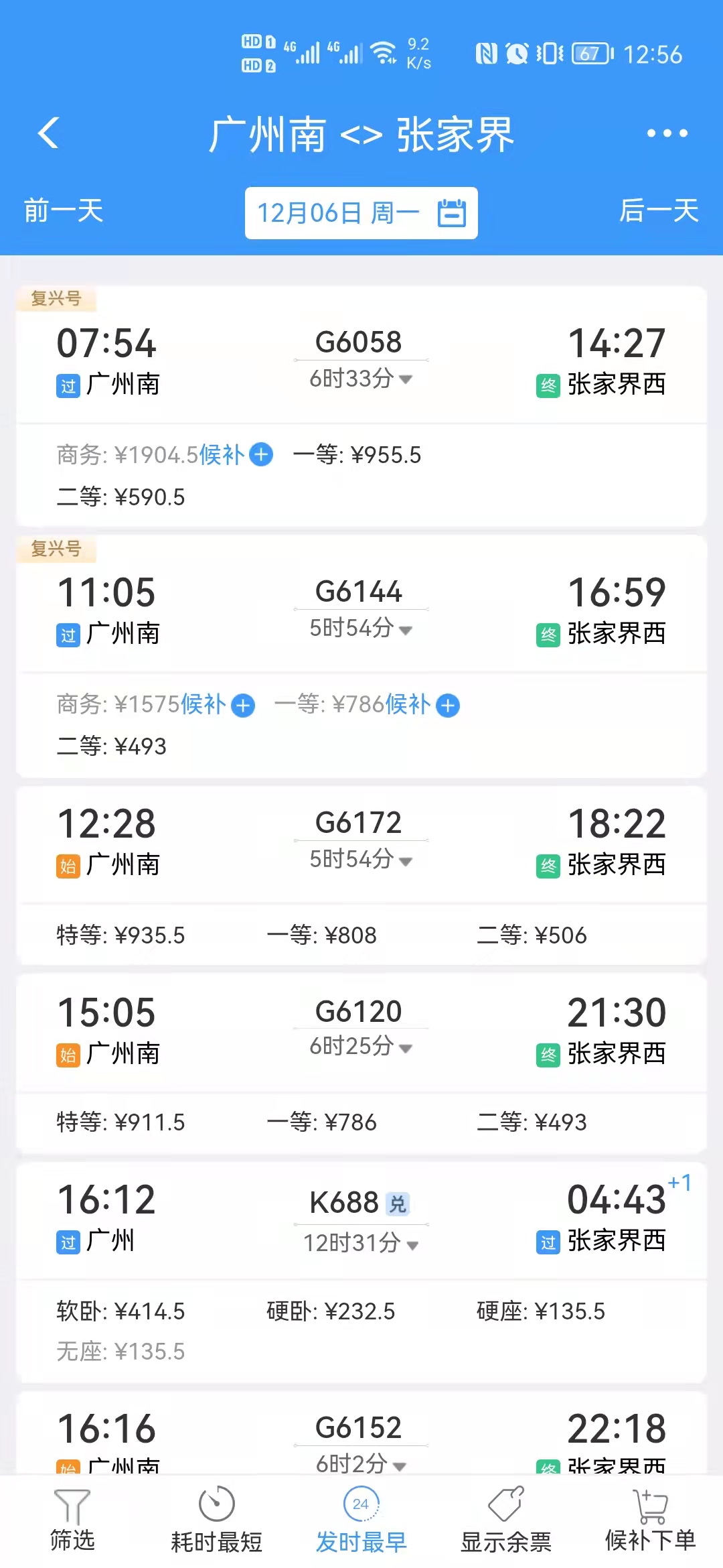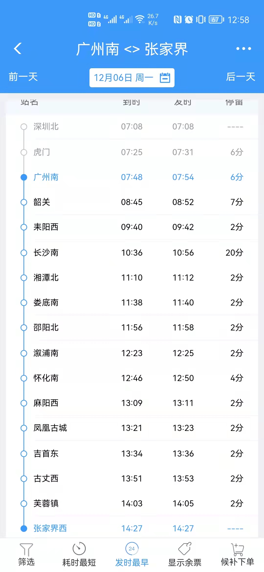 12306App显示,6日上午最早一班从广州南开往张家界西的高铁,站站停。记者截图
