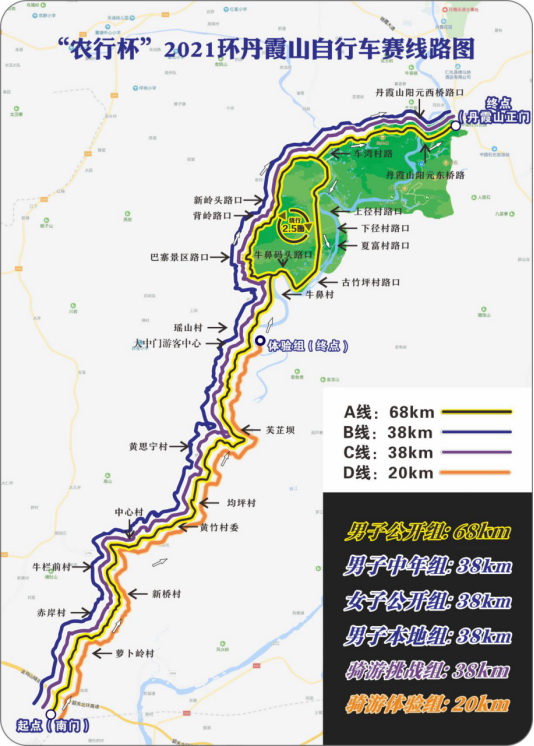 本次环丹霞山自行车赛分为男子公开组(68KM)、男子中年组(38KM)、男子本地组(38KM)、女子公开组(38KM)、骑游挑战组(38KM)、骑游体验组(20KM)六个组别,起点为丹霞山南门,终点为丹霞山正门。其中骑游体验组(20KM)的终点为大中门游客中心。届时,终点还将同时举行400人儿童平衡车赛,共同为“农行杯”2021环丹霞山自行车赛的运动员们打气、助威。