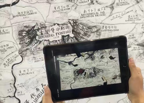 不仅如此,这件作品背后还有着5G、AR技术的结合,观众只需通过用手机打开“寰宇全图”APP,将手机摄像头对准“地图”,边走边寻找作品上不同的识别区域,就能一览精彩有趣的3D场景。