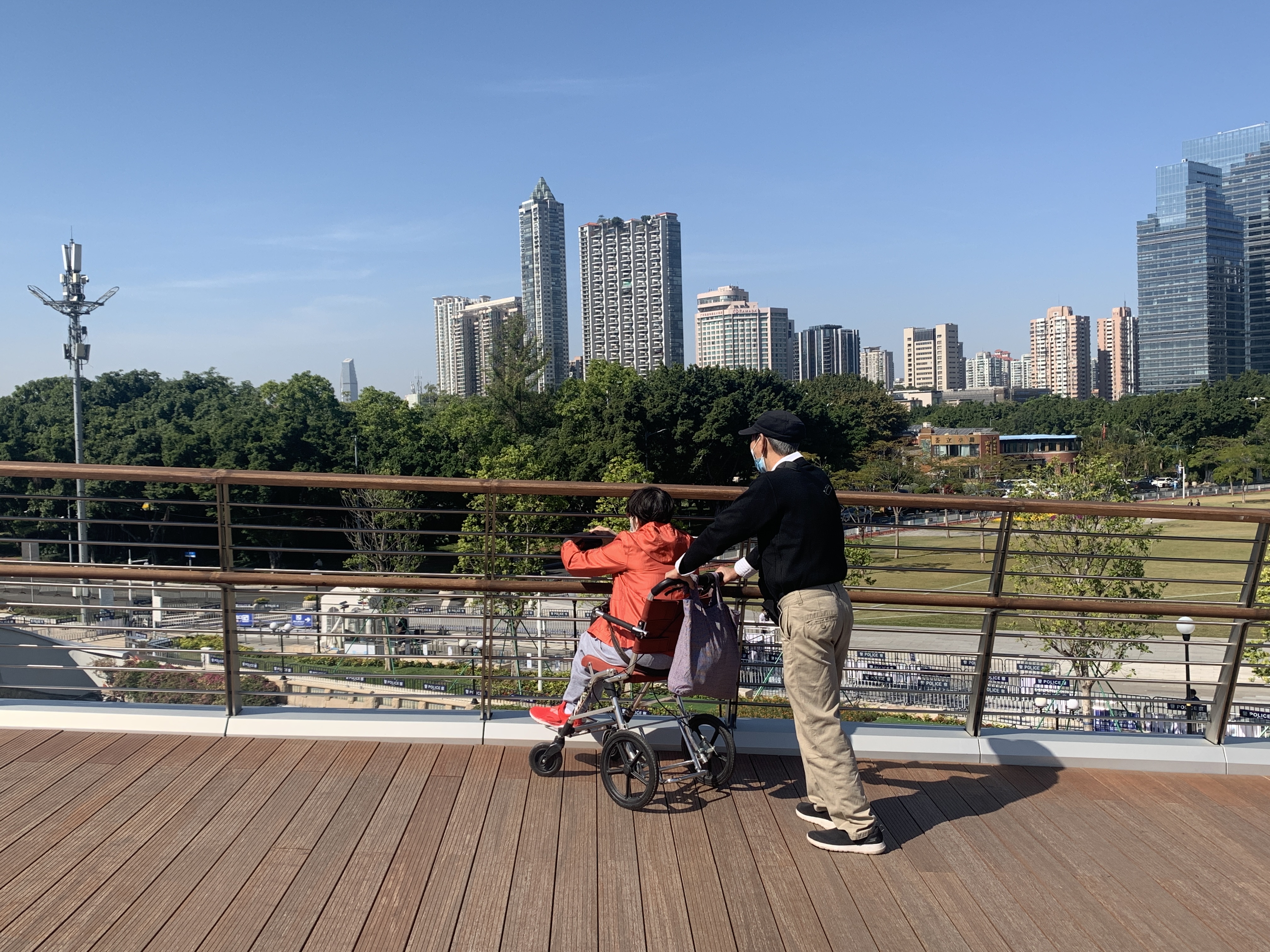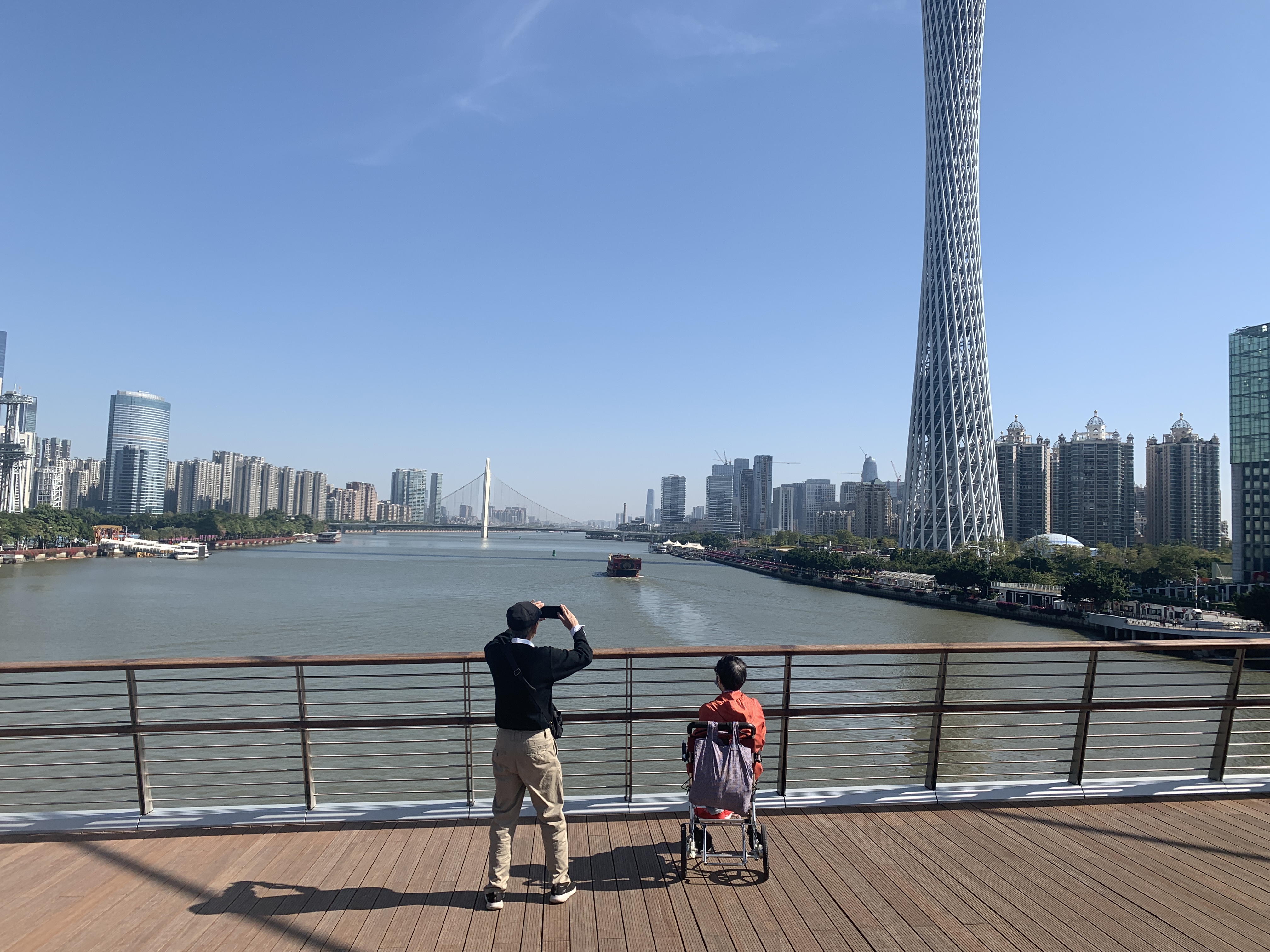 郭叔老两口就住在附近,这一段天气好的时候,他们经常带着水果和点心,到桥上来晒太阳。“有时候我们也会过到二沙岛去,以前推轮椅过江来玩,就是坐地铁或者APM。还在可以推轮椅过海心桥,可以一边走,一边看风景,晒太阳,很方便也很舒服。”年过花甲的郭叔双手推着老伴的轮椅,走上海心桥的无障碍坡道,还时不时停下让老伴拍照留影。