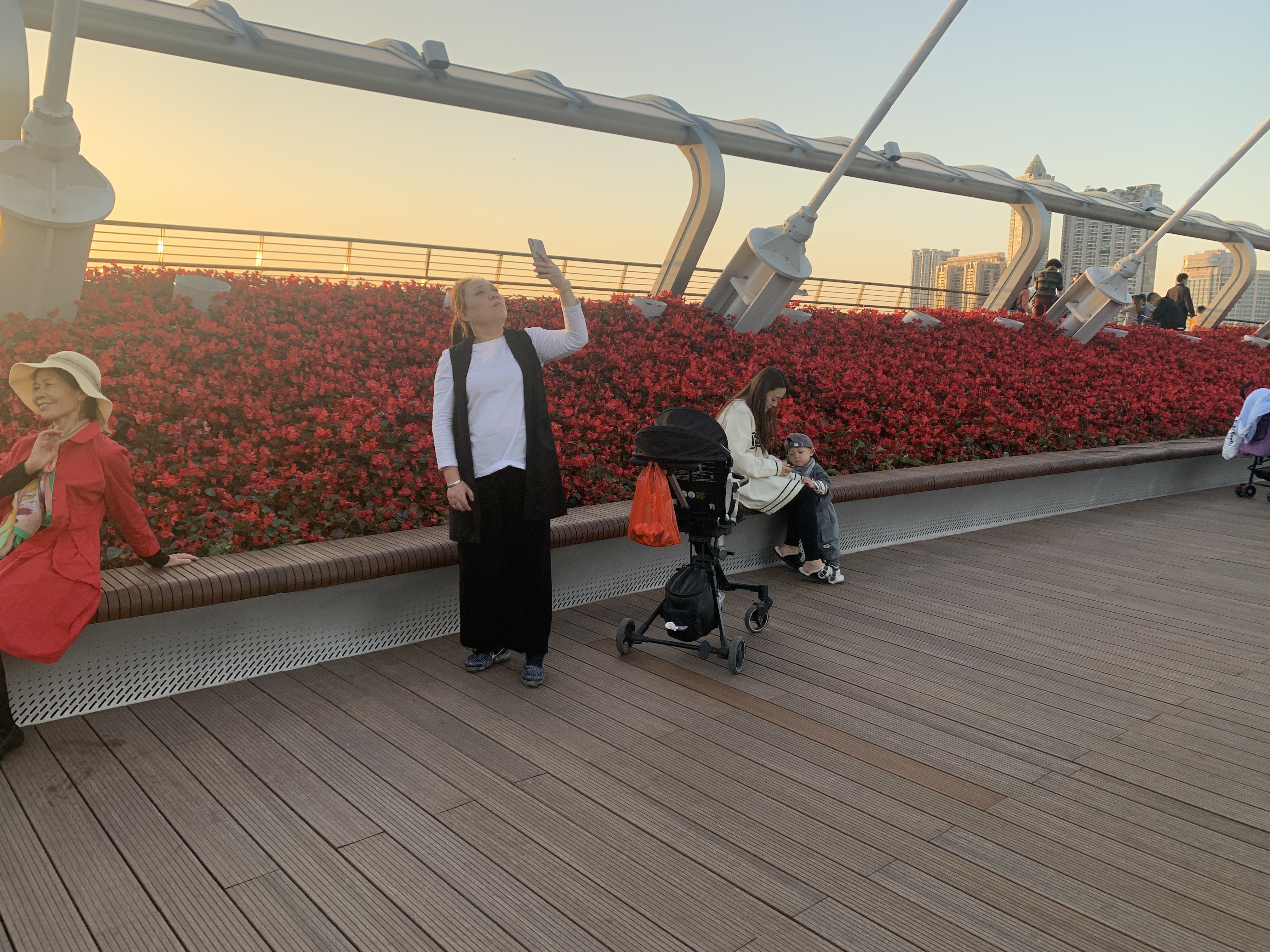 在桥上,郭叔老伴扶着桥上的低位扶手,拍了不少靓图,一边还招呼郭叔过来,跟广州塔、猎德大桥、CBD的写字楼群共同留影。