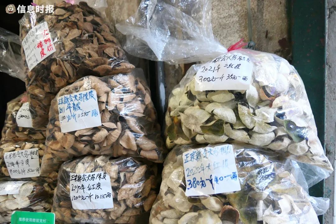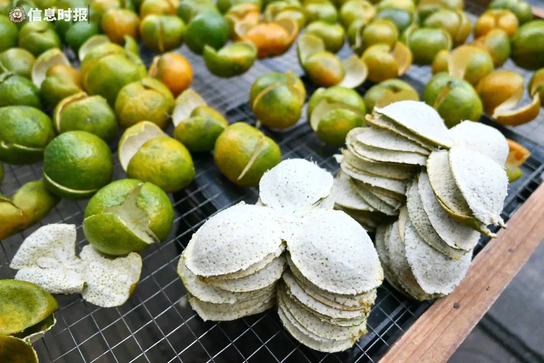 陈皮铺门前衣架上挂着的,是周姨晒了几天的新陈皮,“每天要晒两次,每次晒两三个小时就好,新皮连续晒几天后就可以封起来,1周后打开散一散‘臭青味’,再重复操作一轮就可以了。”但周姨强调,陈皮装袋后还不算万事大吉。“时不时还得检查果皮的状况,天气好就拿出来晒一晒。”