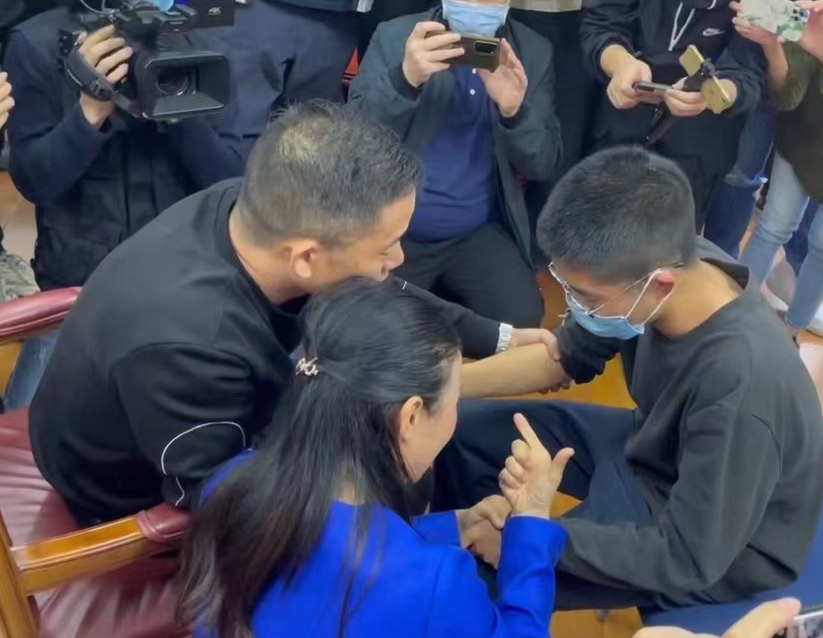 当一家三口坐下后,孙海洋握住孙卓的手,感受儿子的体温,孙海洋妻子小心翼翼掀开儿子的口罩,想看清14年后儿子的模样。她说:“我们有一张你特别特别小的照片,经常都会看。”