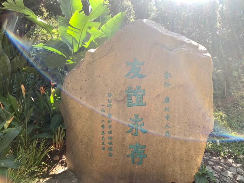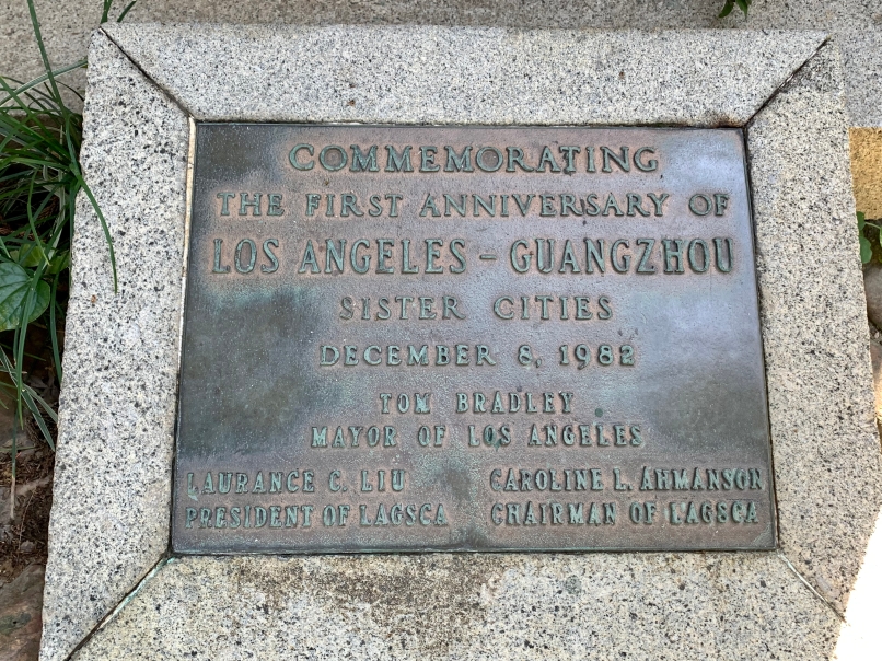 “前方,11993公里!”1998年3月,洛杉矶给广州赠送了一座路向牌,指明洛杉矶在何方。这座高约4米的路牌便竖立在云台谊园的小山坡上,指向洛杉矶市所在方位,路牌上写着:“LosAngeles,11993km. Sistercity of Guangzhou.”意为:“广州的姐妹城市洛杉矶距广州11993公里。”如今,这块路牌也被迁移至广州—洛杉矶友谊花园内。