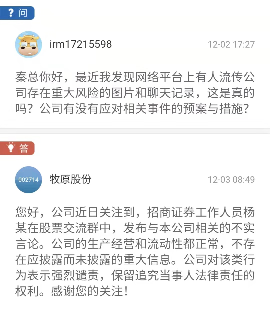 此前网络上流传一客户经理在微信群里发言称牧原股份可能暴雷,将牧原股份推上舆论的风口浪尖。对此,12月3日,牧原股份在互动平台回复称:“公司近日关注到,招商证券工作人员杨某在股票交流群中,发布与本公司相关的不实言论。公司的生产经营和流动性都正常,不存在应披露而未披露的重大信息。公司对该类行为表示强烈谴责,保留追究当事人法律责任的权利。”