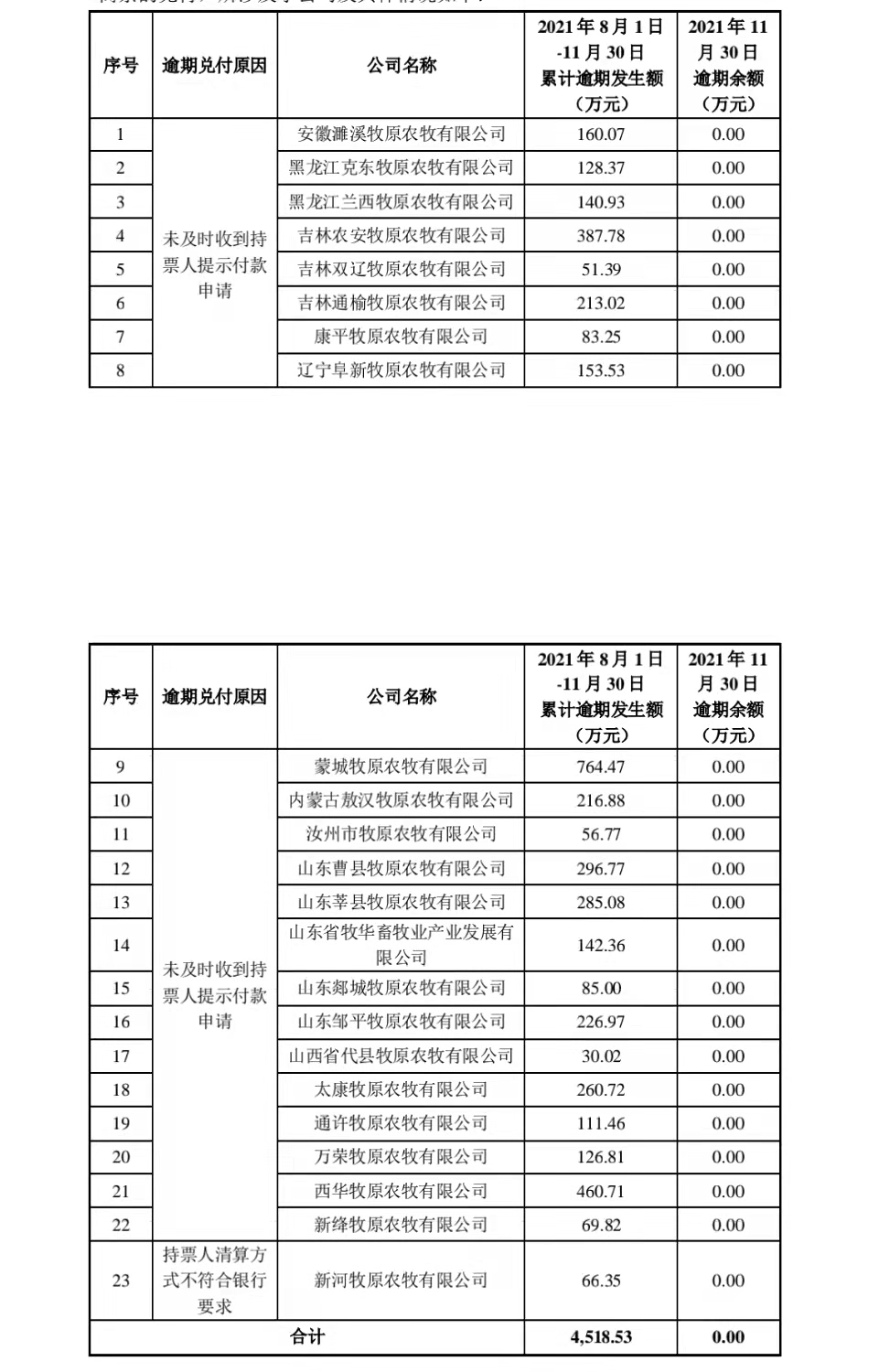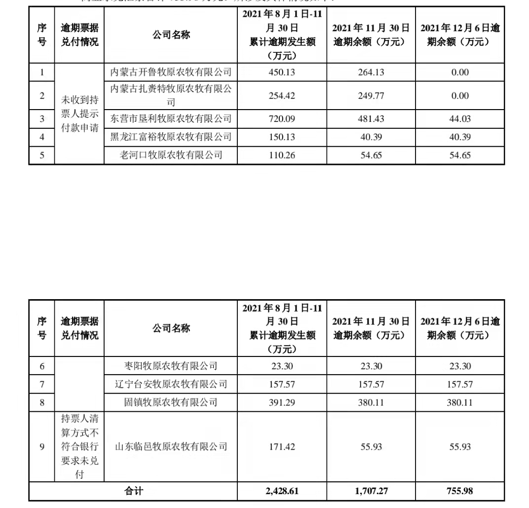 牧原股份旗下超30家公司商票逾期事件持续发酵。12月6日晚间,牧原股份发布公告回应:经公司核实,上海票据交易所于近日公示了《持续逾期名单(截至2021年11月30日)》,2021年8月1日至11月30日,公司共有32家子公司出现付款逾期。经公司核查,截至2021年11月30日,其中23家子公司已完成全部逾期商票的兑付。