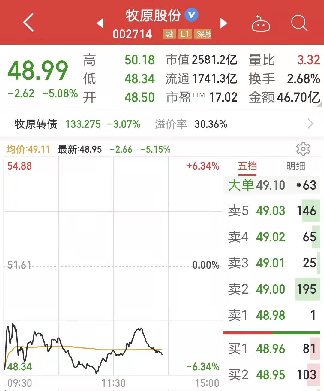 截至12月7日13点53分,牧原股份跌超5%。