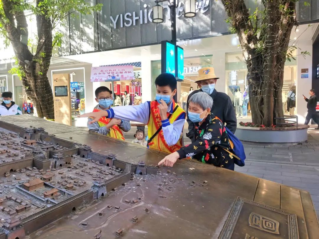 “欢迎大家来到北京路游览,我是导赏志愿者,现在展现在大家面前的是千年古楼遗址……”6名青少年身穿志愿者服、佩戴志愿者绶带,分成3组分别在铜壶滴漏、千年古楼以及清代广州城坊示意图进行定点讲解,精彩的介绍吸引着游客驻足聆听。