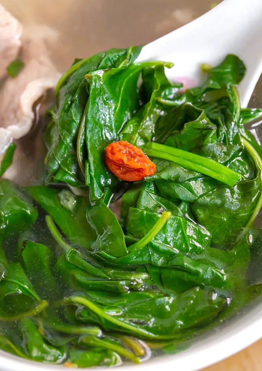 所以,三及第汤中最常见的是有明目清肝作用的枸杞叶,这种枸杞叶是梅州山区特有,和宁夏产果的枸杞叶,甚至是珠三角、粤西的枸杞叶都不太一样,叶片虽然带刺,但更大、更嫩。梅州客家人经常采食这种枸杞叶,用于搭配猪杂汤也自然不过。当然,很重要的一个原因还是枸杞叶和猪杂、猪肉汤有味道上的配合。