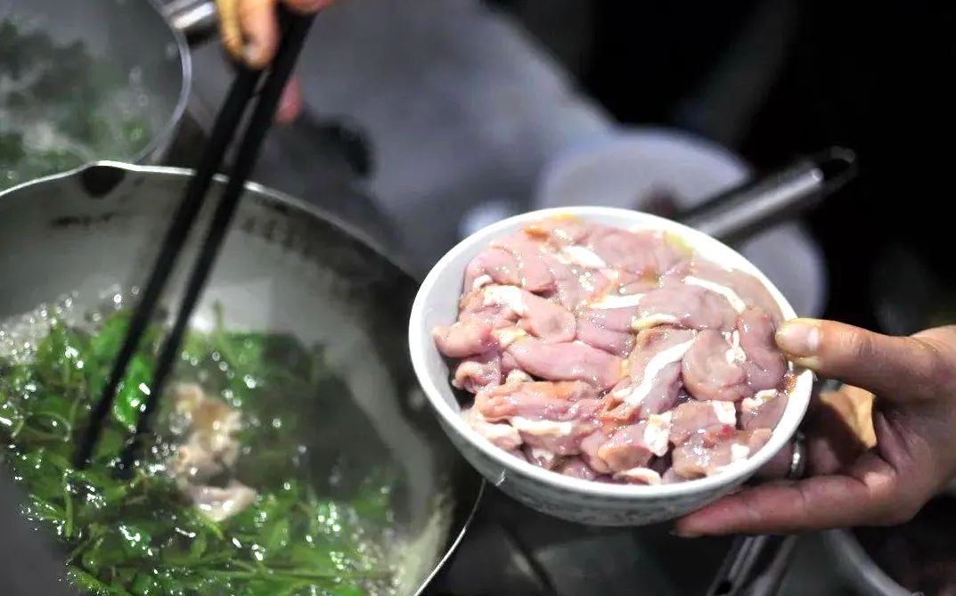 而枸杞叶的好处在于,它不但能吸收膻味,而且吸收了这种膻味以后,反而会显得更加鲜甜。加之枸杞叶快熟,和猪杂一起快煮,正好能一起上桌。