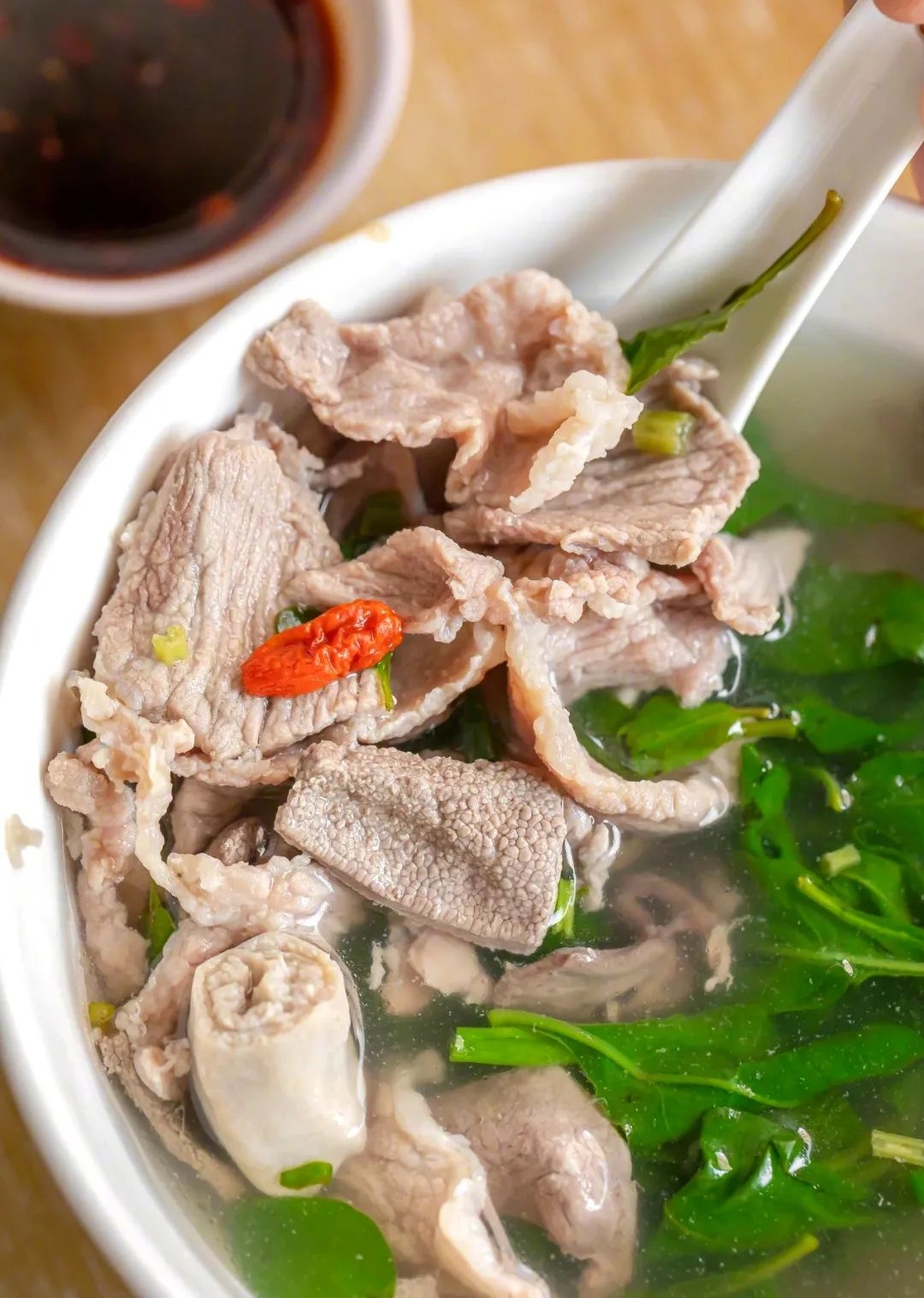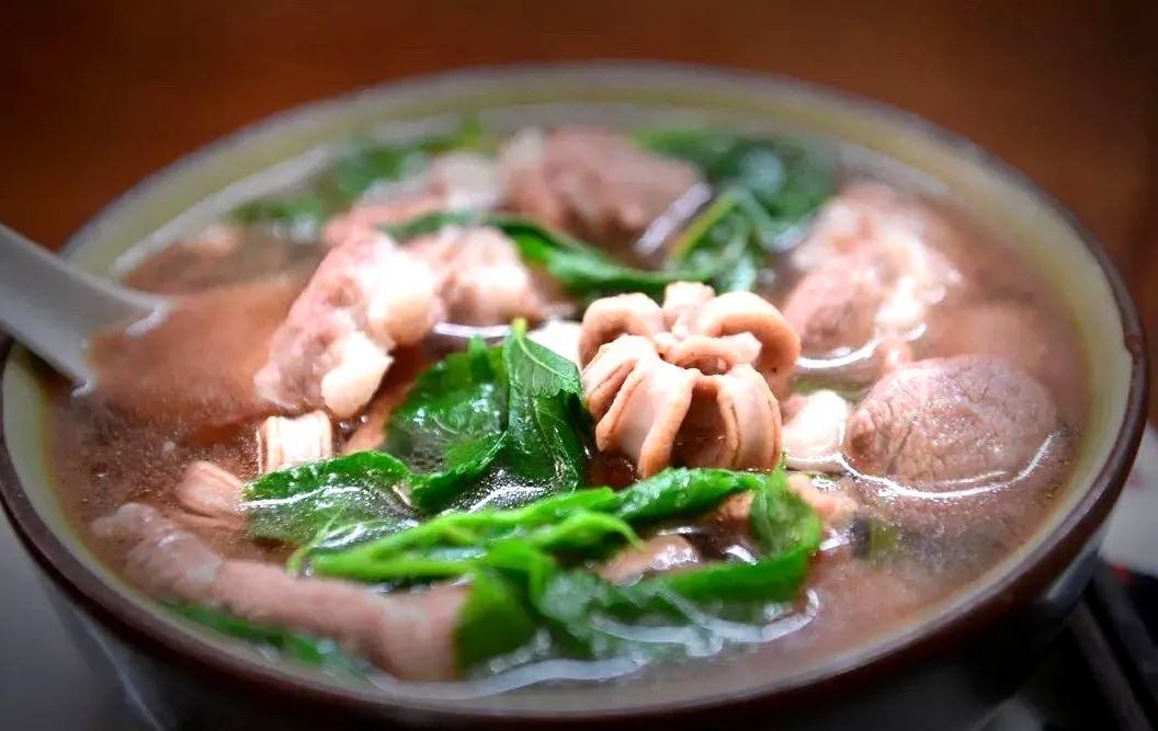 “这几种青菜都是具有清热解毒食疗作用,且口味甘甜,能很好地平衡、克制肉汤的油腻和膻味。”他表示,新鲜猪杂或猪肉,清水一煮,或多或少都会带一点膻味,放姜或葱固然可以去腥,但效果并不是最好的,因为姜葱会轻微改变猪杂汤的味道,尤其是姜片,喝汤时嚼到姜片不但会影响口感,还会带出不和谐的辛辣味。