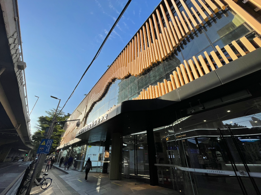 当小e来到广州十三行文化科技中心正门,首先映入眼帘的是门面装潢,以长短木栅格纵向排列的设计风格,模拟出海浪翻涌时高低错落的画面,当中还加入商船等十三行历史文化元素,还原了海上丝绸之路的贸易氛围。
