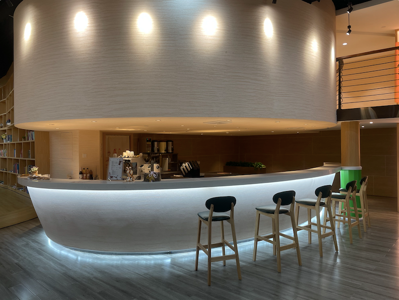 中心内部还以文化公园“园中园”的概念重新对空间进行划分布局,在中庭处开辟出中空空间,立柱部分采用木料进行包裹,以原木色为基调,模拟出船桅的造型,内墙也通过局部挖空的形式,塑造出船舱的感觉。