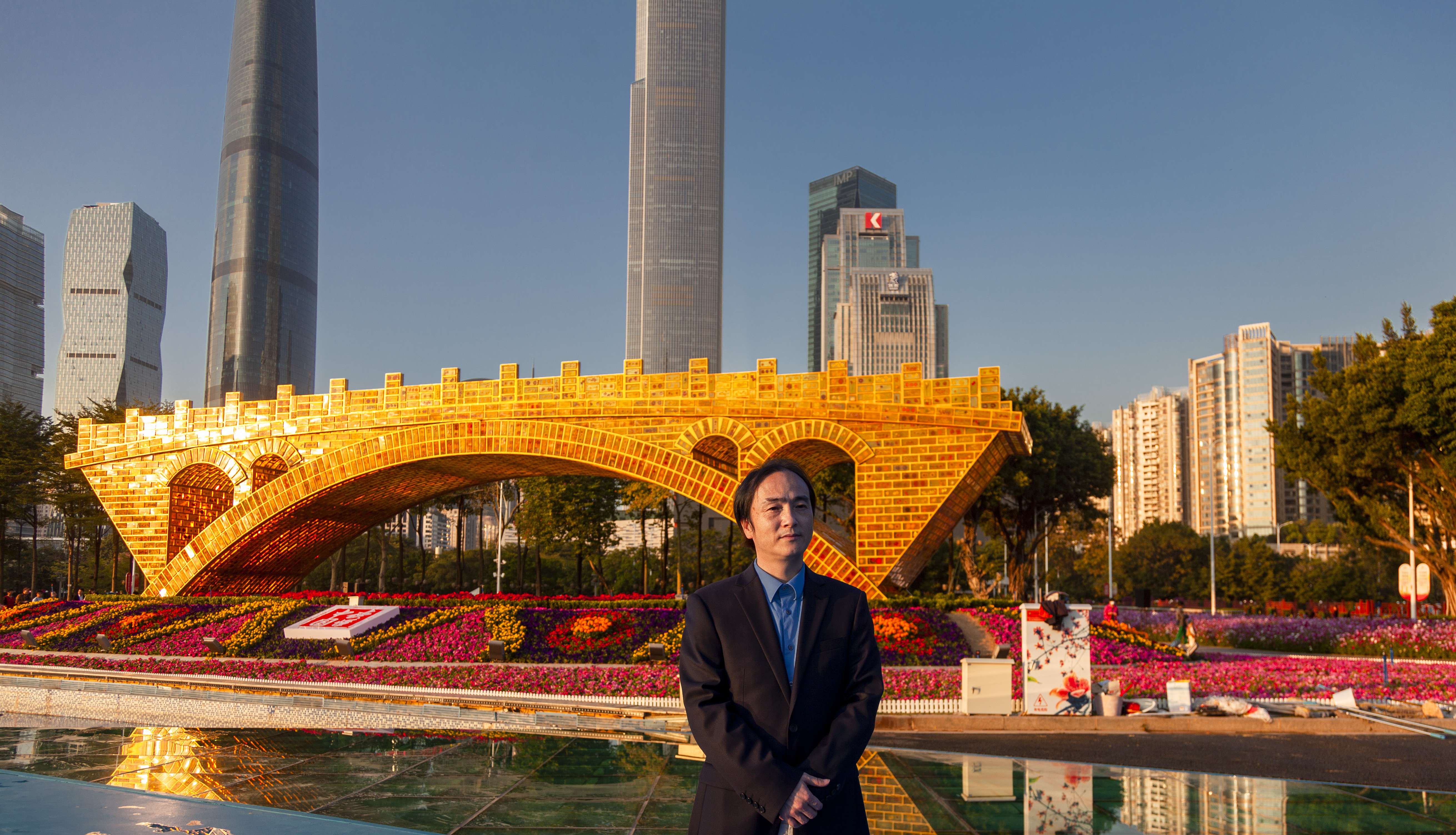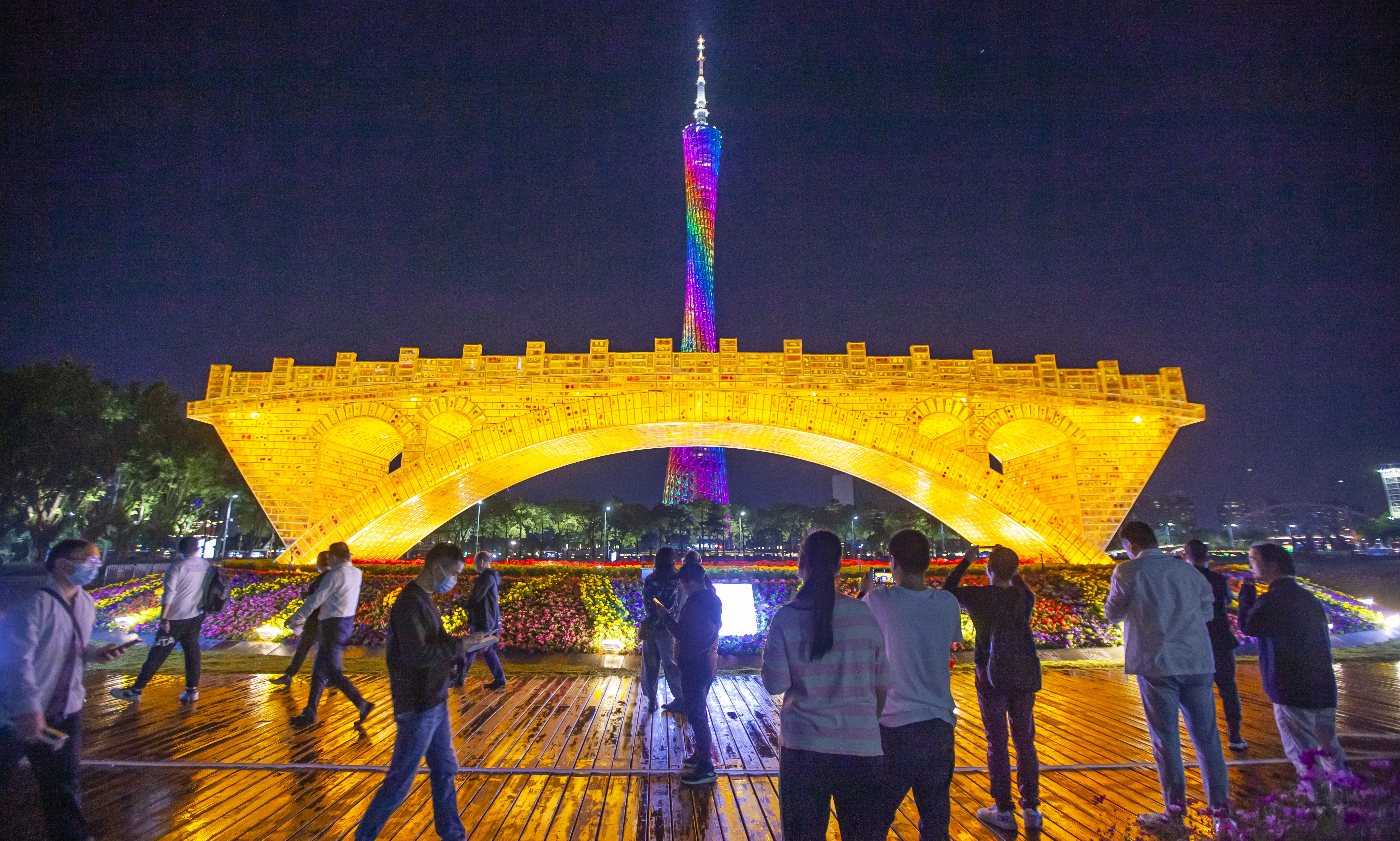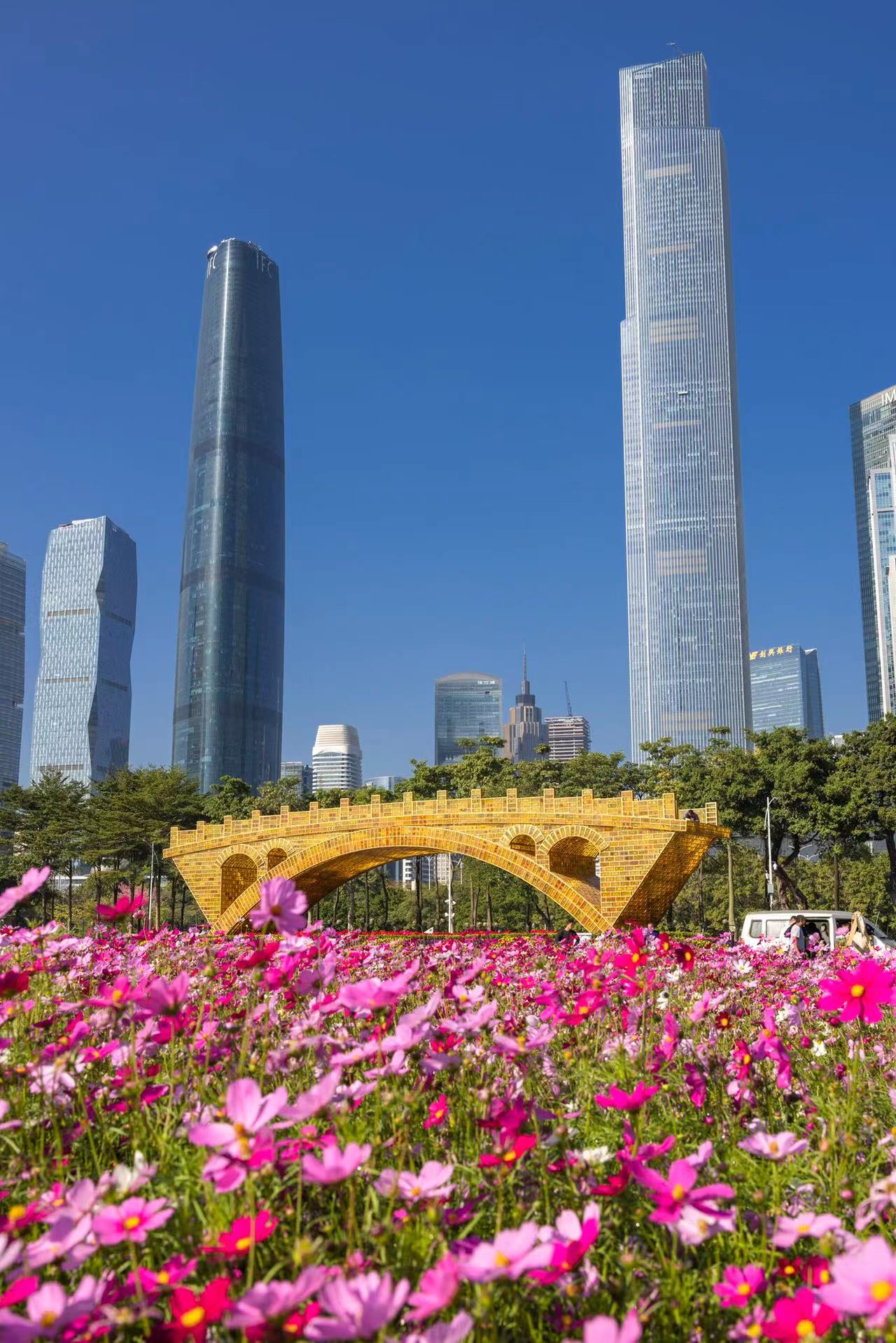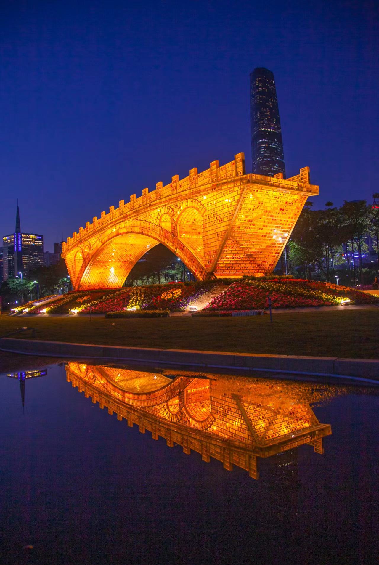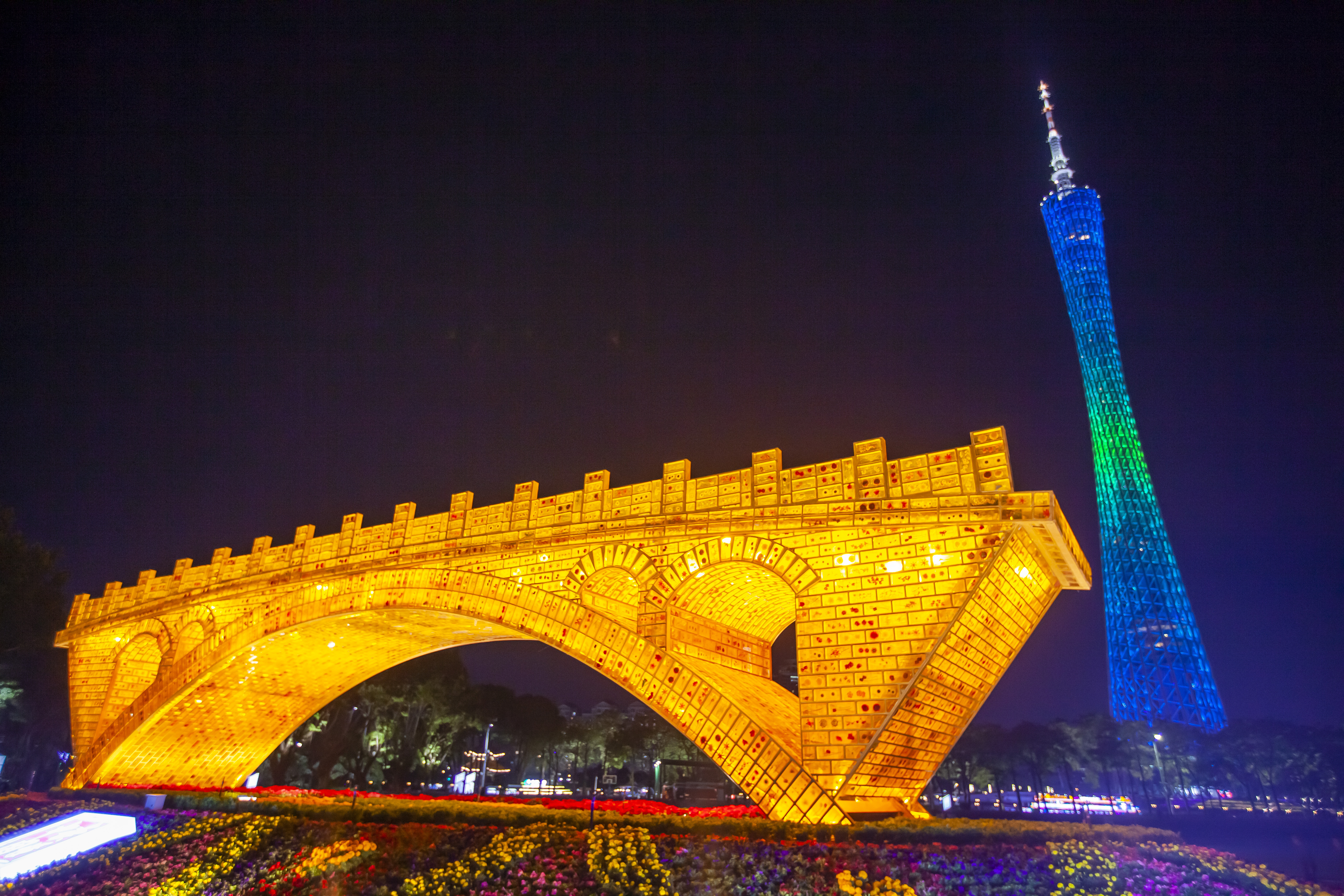 被万千花朵簇拥着的《丝路金桥》和远处的小蛮腰刚好形成一种参差错落的空间关系。当夜幕降临,琥珀砖内部透出的金黄色和广州塔的七彩灯光,为市民呈现出丰富多元的视觉盛宴。