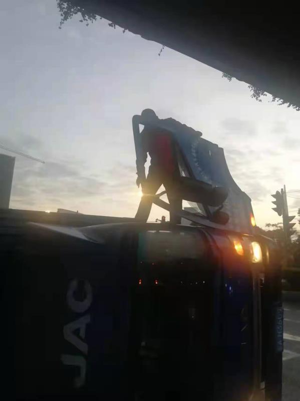 人已经救出,但危险还没解除。这时路上已有几个行人驻足揪心地看着这一幕,胡宗林跟他们大声喊道:“看看有没有漏油?”爬下车后,他左右打探了一圈,确认情况转危为安,货车司机无甚大碍。指导对方摆放好三脚架后,他提醒后方来车注意避让,才安心驾车离去。